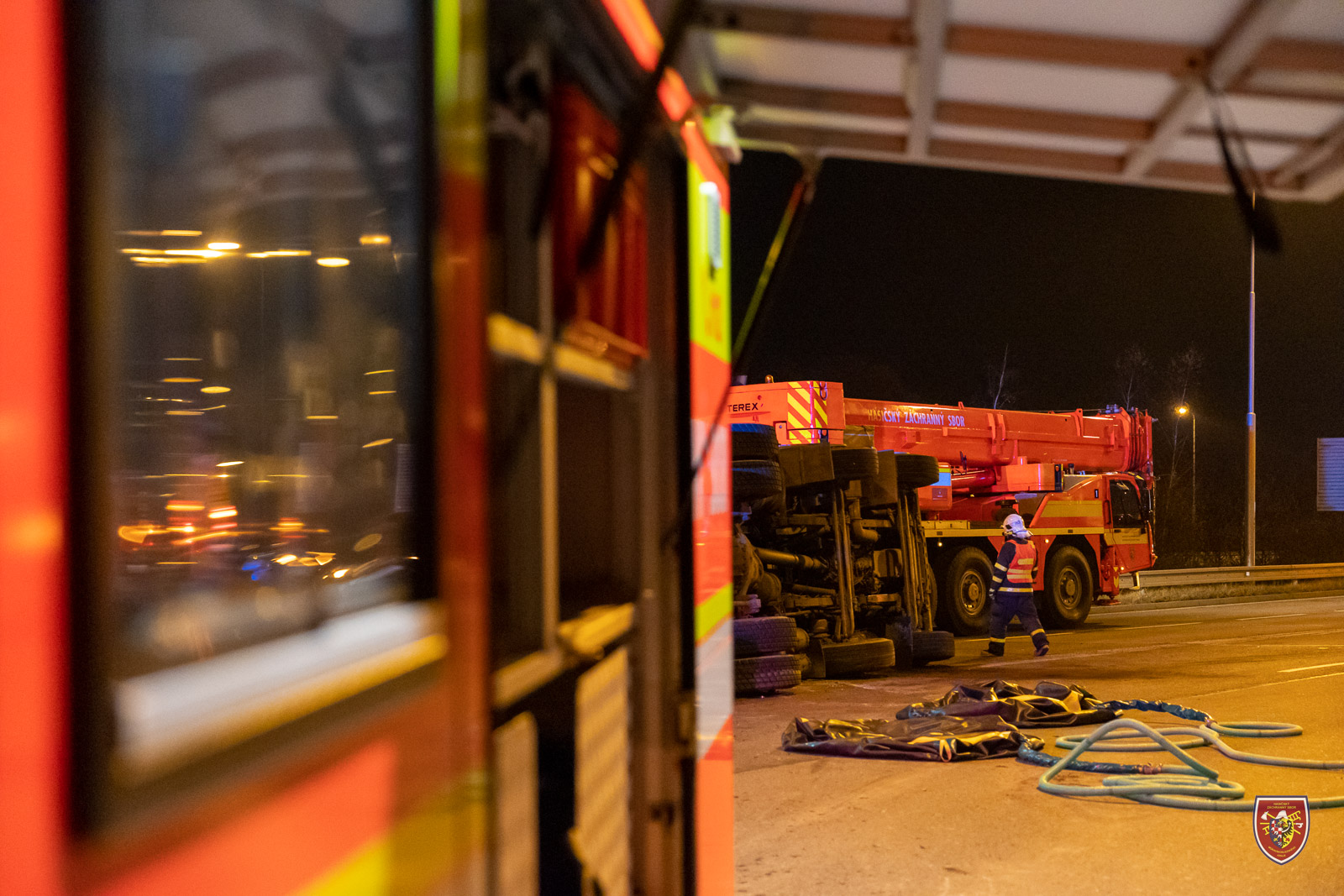 Řidič si zajistil náhradní automobil pro přeložení nákladu, poté velitel zásahu na místo povolal vyprošťovací techniku ze stanice HZS MSK v Ostravě-Zábřehu. Ve spolupráci s majitelem pak hasiči sundali z převráceného automobilu kontejner a nosič převrátili zpět na kola.
