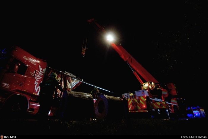 Dvě jednotky profesionálních hasičů (HZS MSK) zasahovaly v pondělí 7.9.2020 večer více než čtyři hodiny ve Fryčovicích (okres Frýdek-Místek) u nehody nákladního automobilu Scania, jehož návěs sjel do příkopu i se sedmi několikatunovými svitky plechu a dalšími kovovými součástkami v bednách. Těžká hasičská technika – Bizon a jeřáb – nejprve vykládala svitky, pak se hasičům podařilo vyprostit i zapadlý návěs.