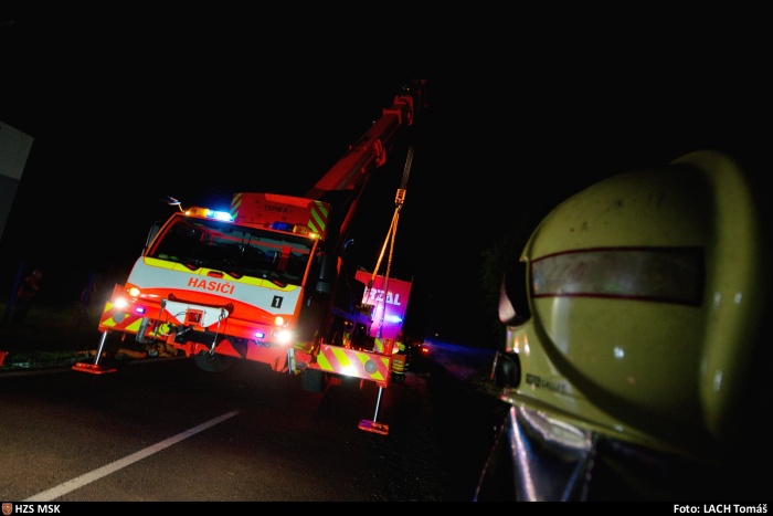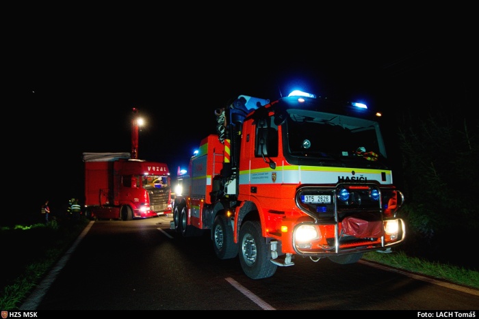 Operační středisko hasičů bylo o nehodě, která se obešla bez zranění, informováno v pondělí po půl sedmé večerní. Do Fryčovic vyjely dvě jednotky Hasičského záchranného sboru Moravskoslezského kraje (HZS MSK) - ze stanic Frýdek-Místek a Ostrava-Zábřeh, odkud mj. přijel vyprošťovací speciál MB Actros Bizon a automobilový jeřáb Demag/Terrex.