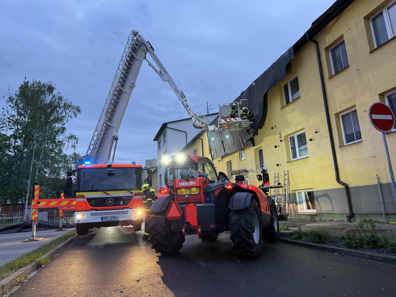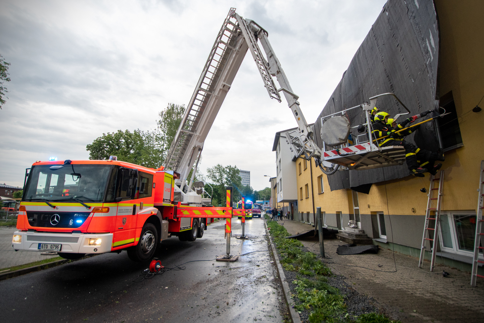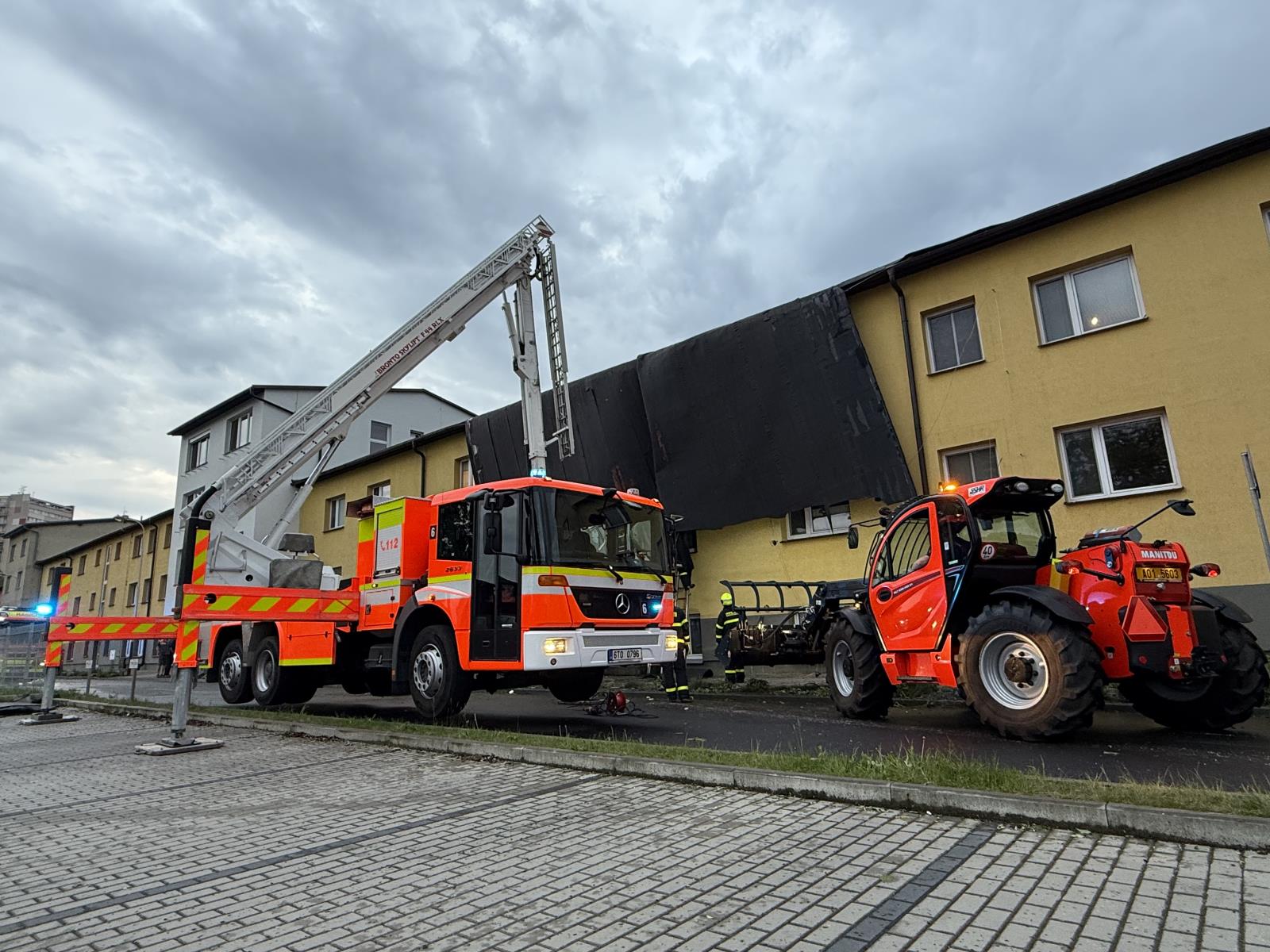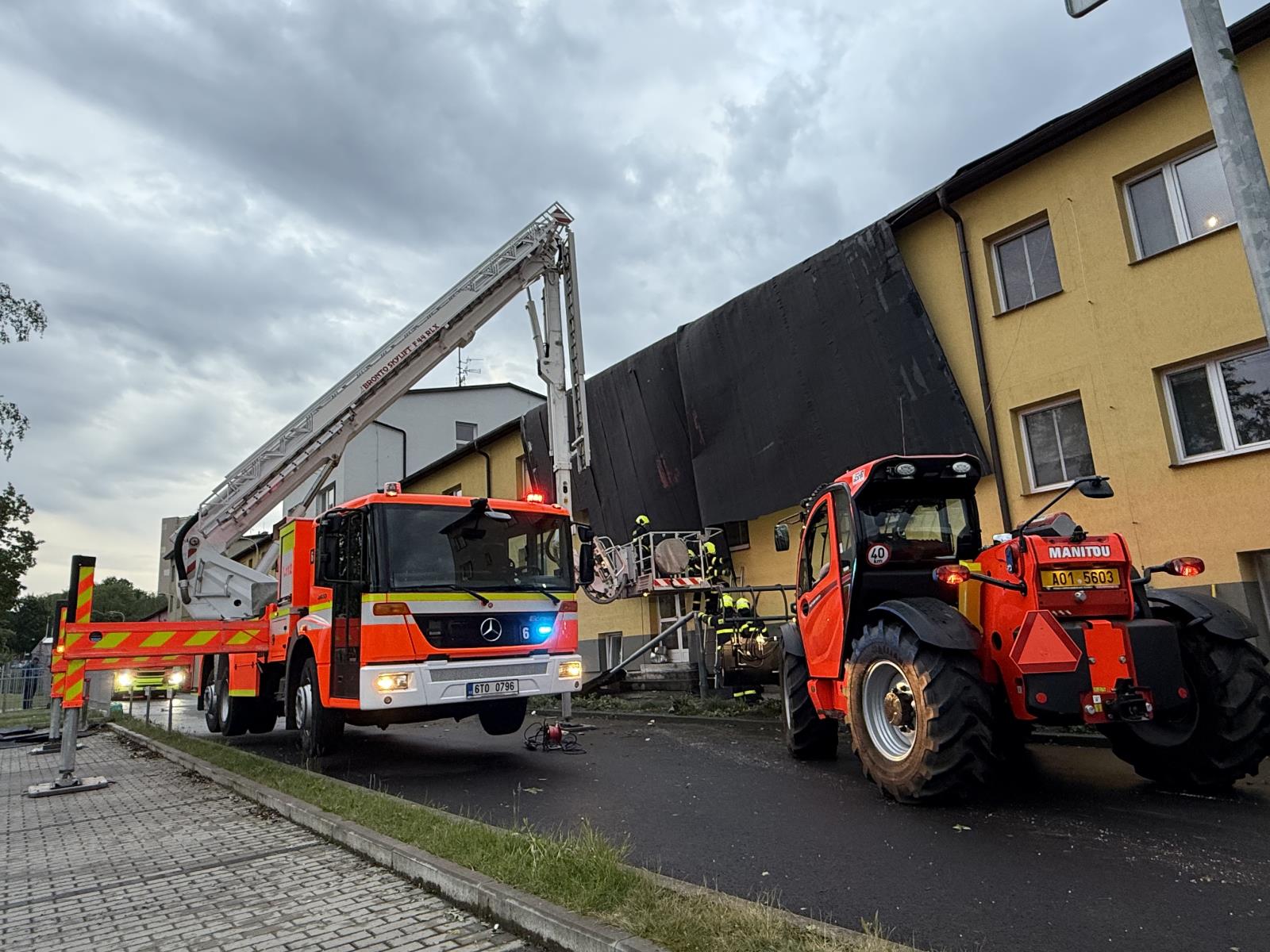 Informace o události přijala tísňová linka okamžitě a vyslala profesionální i dobrovolné jednotky. Kromě místních hasičů přijela i specializovaná jednotka z Nového Jičína vybavená zastřešovacím kontejnerem. Práce na střeše probíhaly za pomoci výškové techniky i vycvičených hasičských lezců, kteří odstranili poškozenou krytinu a instalovali krycí plachty, aby zabránili dalším škodám.