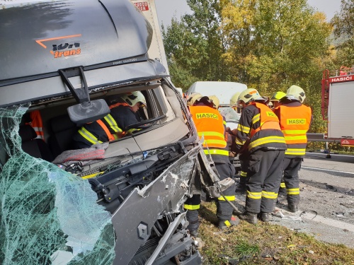 Tři jednotky hasičů zasahovaly v pondělí 8.10.2018 v obci Ostravice (okres Frýdek-Místek) u nehody dvou nákladních automobilů Renault a Volvo a třetího vozidla - dodávky Ford Tranzit. Zraněni a zaklíněni v kabinách zůstali řidiči renaultu a tranzitu a hasiči je museli vyprošťovat.