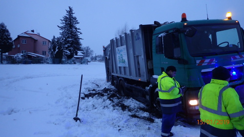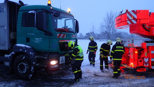 Profesionální hasiči z Karviné (HZS MSK) zasahovali v úterý 15.1.2019 odpoledne v Karviné-Hranicích u nehody svozového nákladního vozidla Man, který sjel při couvání k rodinnému domu ze zasněžené komunikace pravou částí vozidla na travnatý porost skrytý pod čerstvou vrstvou sněhu a vůz v něm uvízl. Vyprostit jej musel až hasičský jeřáb AC 40 Demag/Terex.