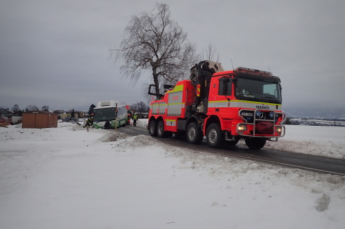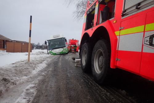 techn5.jpgTři jednotky profesionálních hasičů (HZS MSK) se zapojily ve středu 16.1.2019 ráno v Českém Těšíně-Mistřovicích (okres Karviná) do vyprošťování prázdného autobusu, který sjel ze zasněžené cesty plné sněhových jazyků pravou stranou do příkopu. Na pomoc s vytažením musely přijet dva speciály - Bizon z Ostravy a automobilový jeřáb Demag/Terex z Karviné.