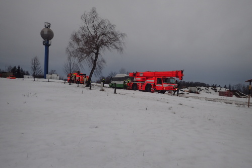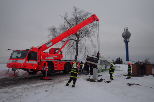 Vyprošťování autobusu v Českém Těšíně těžkou hasičskou technikou