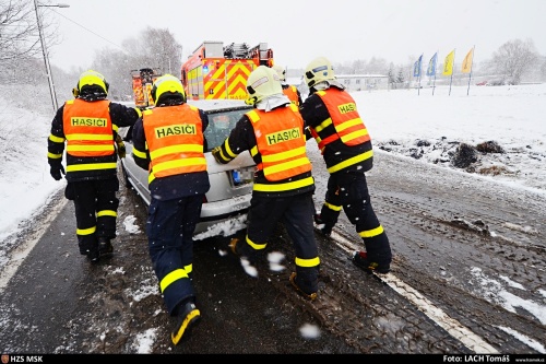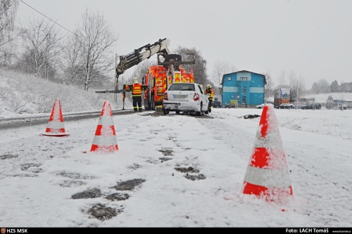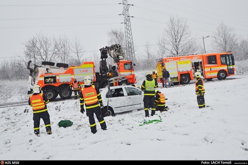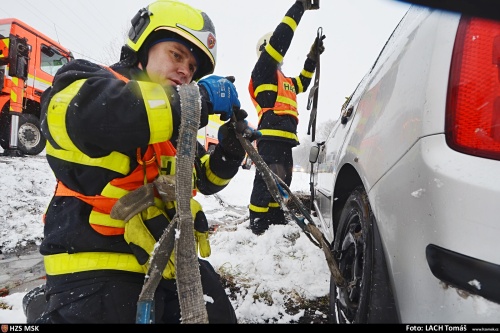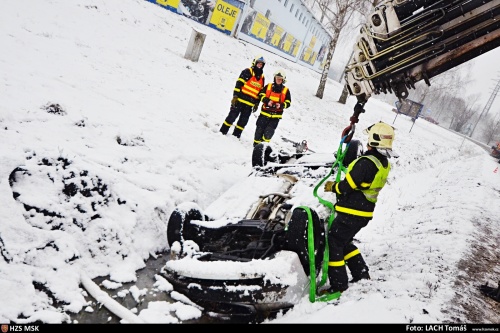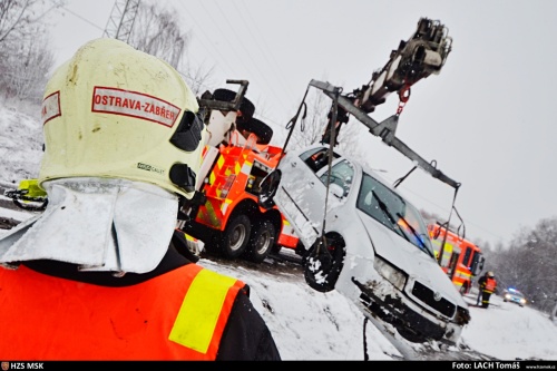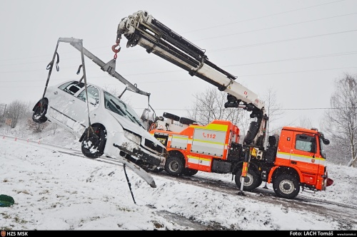 Dvě jednotky ostravských profesionálních hasičů (HZS MSK) zasahovaly v úterý 15.1.2019 kolem poledne v Ostravě-Hrušově u nehody osobního automobilu Škoda Fabia, který skončil v příkopu na střeše. Mladá řidička byla zraněna. Fabii pomohl na silnici tradičně hasičský Bizon.