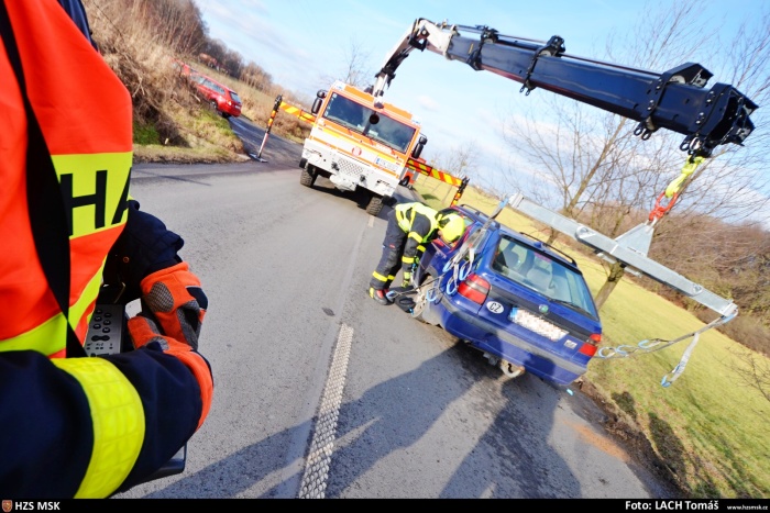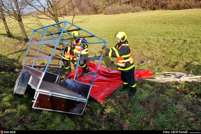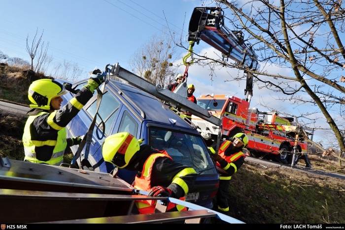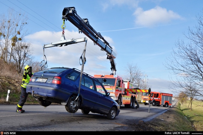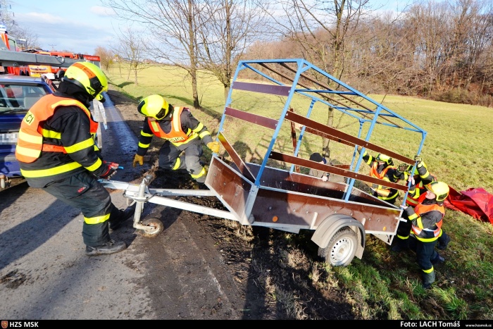 Tři jednotky hasičů zasahovaly ve čtvrtek 23.1.2020 odpoledne na silnici mezi Vratimovem (okres Ostrava-město) a Frýdkem-Místkem u nehody osobního automobilu Škoda Felicia s přívěsným vozíkem, které skončily v příkopě.