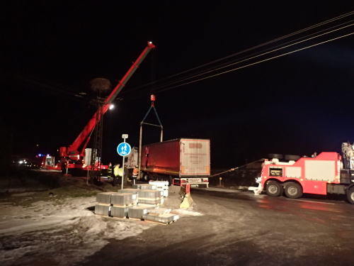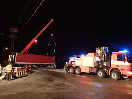 Před vyprošťováním hasiči pomocí hydraulické ruky Bizona vyložili z kamionu 24 tun plechů a odřezali rozbrušovacími pilami zničená svodidla. Kamion se podařilo postavit na silnici pomocí Bizona a jeřábu a potáhnout na okraj, aby nepřekážel, ještě za tmy. Po prosolení kluzké silnice sypačem zde byla doprava obnovena v pondělí kolem půl osmé ráno.