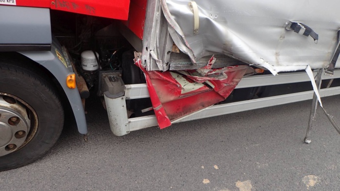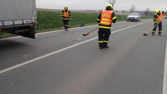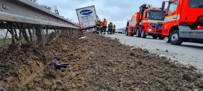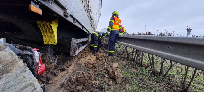 Tři jednotky profesionálních hasičů (HZS MSK) zasahovaly v úterý 13.4.2021 ráno u nehody kamionu Scania s nákladem 23 tun trubek, který skončil zaražený ve středových svodidlech a měkké hlíně na dálnici D1 u Suchdolu nad Odrou (okres Nový Jičín) ve směru na Brno. Hasiči museli kamion vyprostit pomocí automobilového jeřábu a Bizona, aniž by byl zastaven průjezd vozidel.