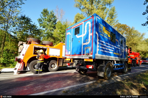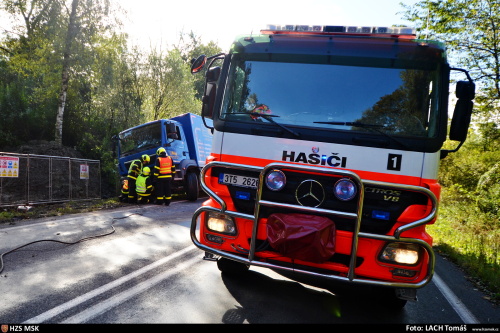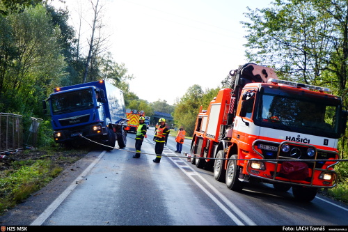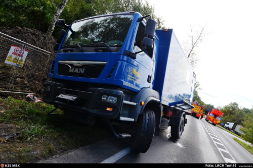 Tři jednotky hasičů zasahovaly v pátek 15.9.2017 dopoledne v Ostravě-Radvanicích u nehody montážního vozu Man, který se probořil pravými koly do rozmoklé půdy v příkopu vedle silnice, nebezpečně se naklonil a hrozilo jeho převrácení. Zasahovat musela těžká technika HZS MSK.