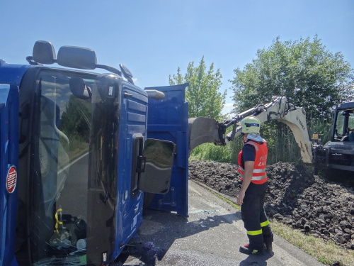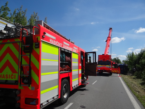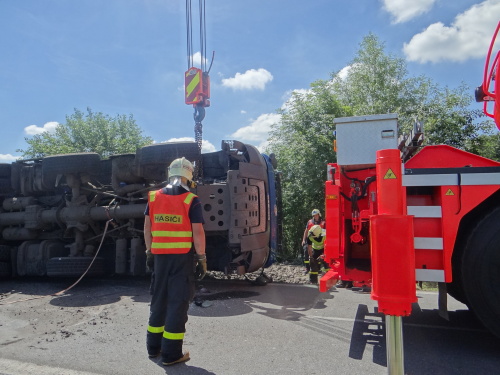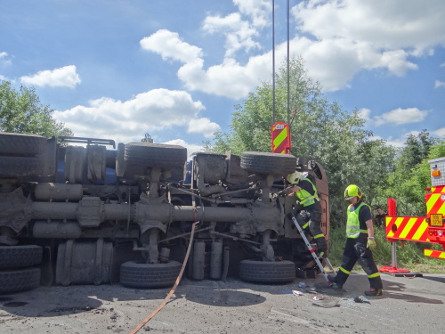 Při pádu nákladní tatry na levý bok na silnici se zranil na hlavě jeho řidič, řidič osobního auta vyvázl bez zranění. Hasiči tatru postavili pomocí těžké techniky na kola a odtáhli do nedalekého sídla firmy.