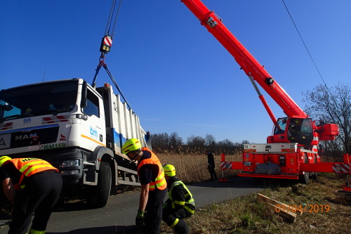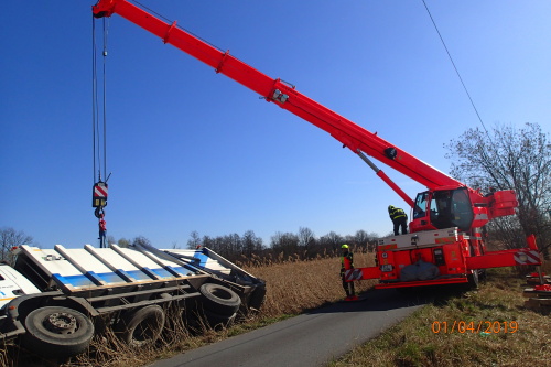 Jeřáb pomalu zvedal kukavůz na silnici, omars jistil úspěšné vytažení lanem zadního navijáku. Řidič Manu vyvázl bez zranění.