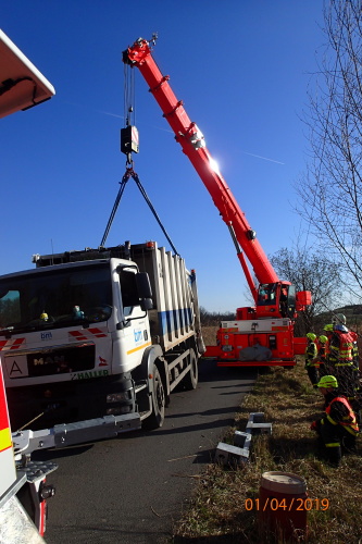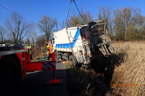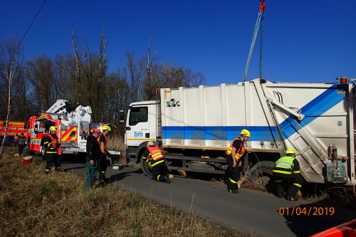Tři jednotky profesionálních hasičů (HZS MSK) zasahovaly v pondělí 1.4.2019 odpoledne v Bohumíně, místní části Nový Bohumín (okres Karviná), u nehody těžkého popelářského vozidla Man. To skončilo v příkopu na pravém boku. Na pomoc musel vyjet hasičský jeřáb z Karviné a vyprošťovací speciál omars z Ostravy.
