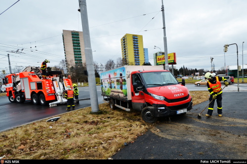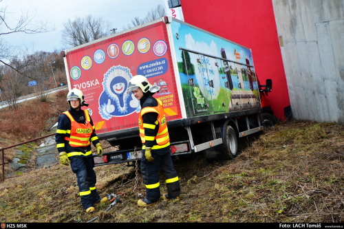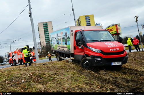 Dvě jednotky profesionálních hasičů (HZS MSK) zasahovaly ve čtvrtek 23.2.2017 kolem poledne v Ostravě u křižovatky Hornopolní a Novinářské ulice u nehody nákladního automobilu Iveco se zmrzlinou s osobním automobilem Citroën. Zmrzlinářské auto skončilo ve svahu ve zdi autosalonu v Hornopolní ulici, kvůli jeho vyproštění sem nakonec musel přijet i hasičský speciál Bizon.