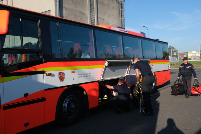 Jde o profesionální hasiče ze dvou územních odborů (okresů) HZS MSK – Opava a Nový Jičín, společně s nimi vyrazily dvě jednotky sboru dobrovolných hasičů – Fulnek a Kopřivnice (obě okres Nový Jičín). Dobrovolní hasiči jedou i s jejich cisternami, profesionální hasiči z HZS MSK služebním autobusem Karosa – cisterny převezmou od střídajících kolegů až na místě zásahu.
