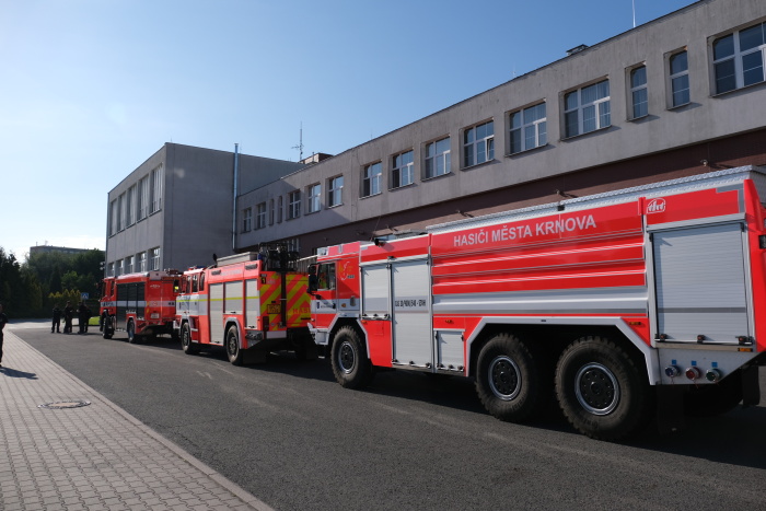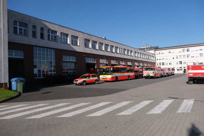 Dobrovolní hasiči jedou i s jejich cisternami, profesionální hasiči z HZS MSK služebním autobusem Karosa – cisterny převezmou od střídaných kolegů až na místě zásahu.