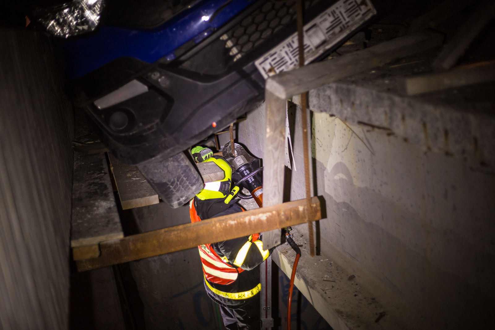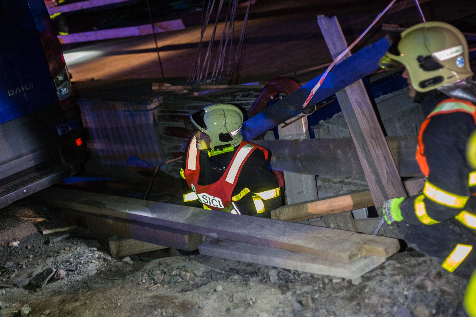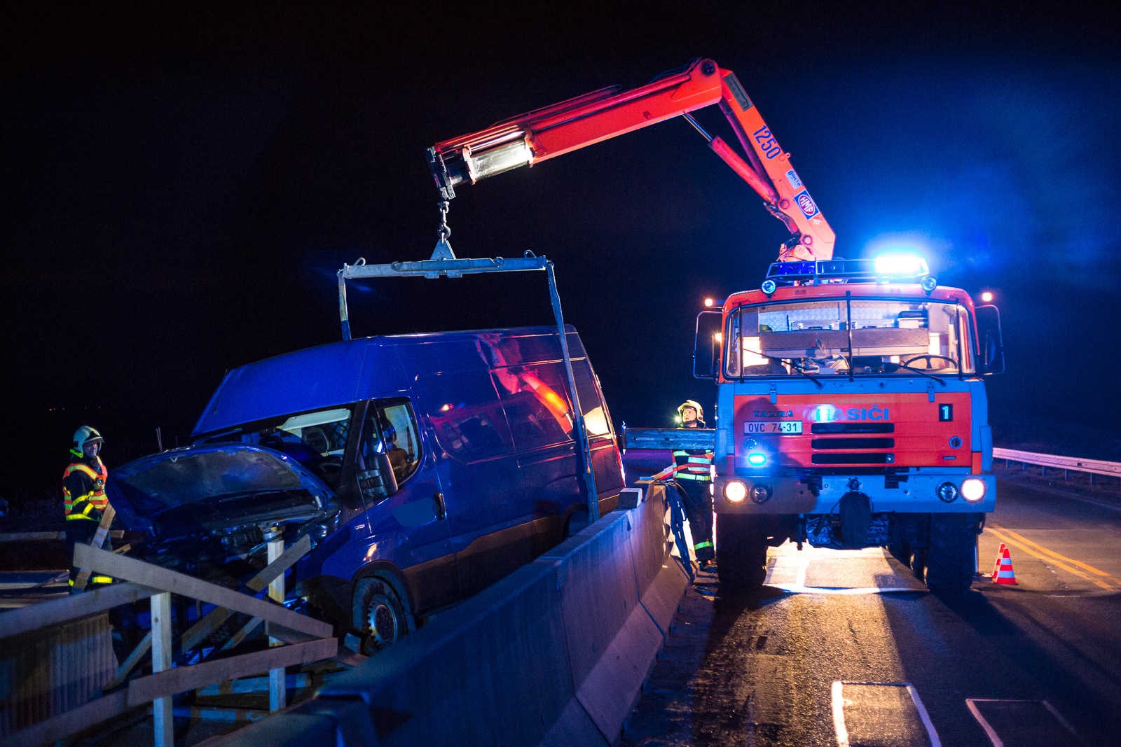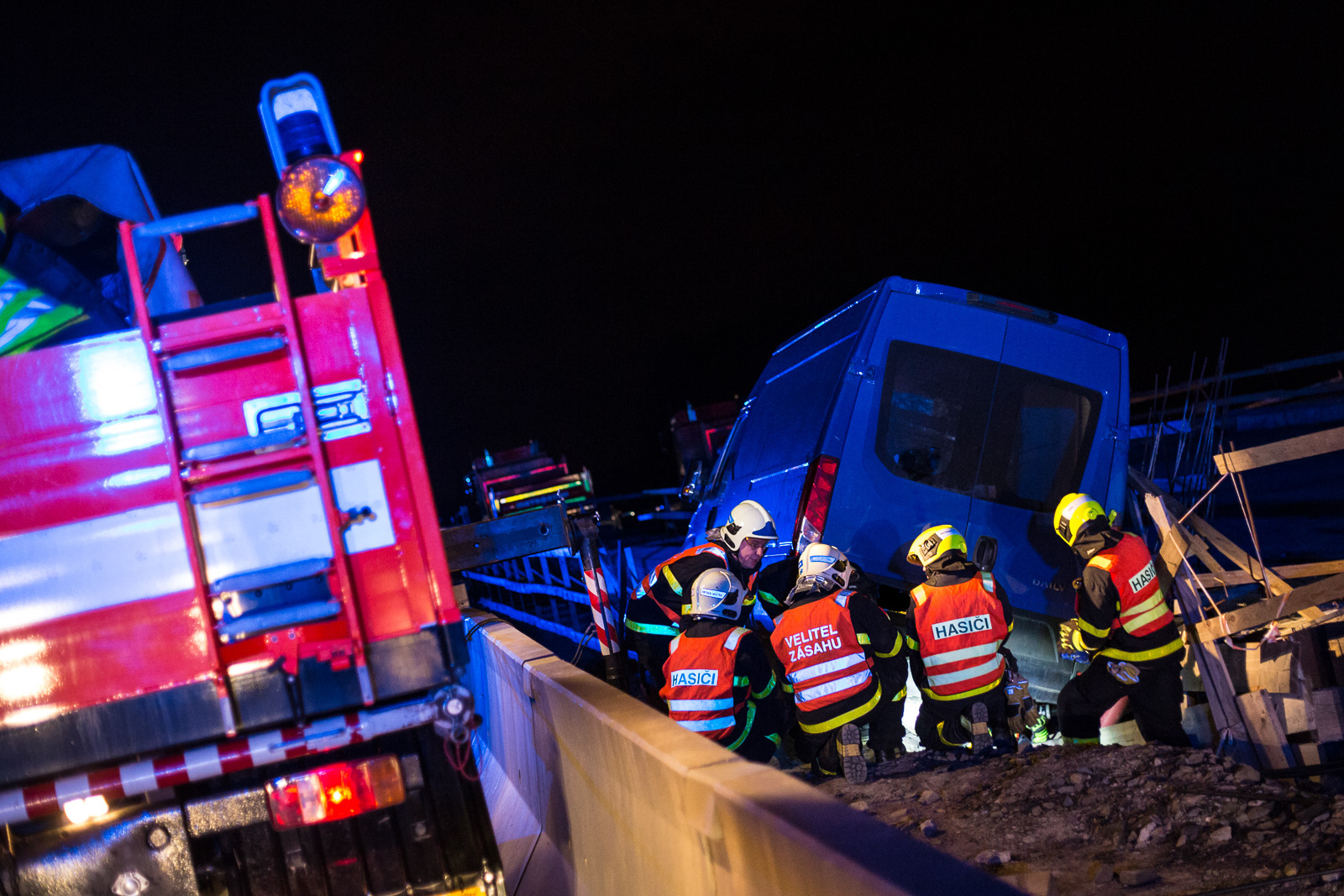 Hasiči po příjezdu zjistili, že řidič dodávky Iveco Daily, převážející náklad zhruba 800 kilogramů tiskovin, vyjel mimo těleso rozestavěného dálničního mostu. Vůz zůstal zaklíněný v mezeře mezi jednotlivými konstrukcemi, řidič z něj však vyvázl nezraněn.