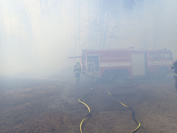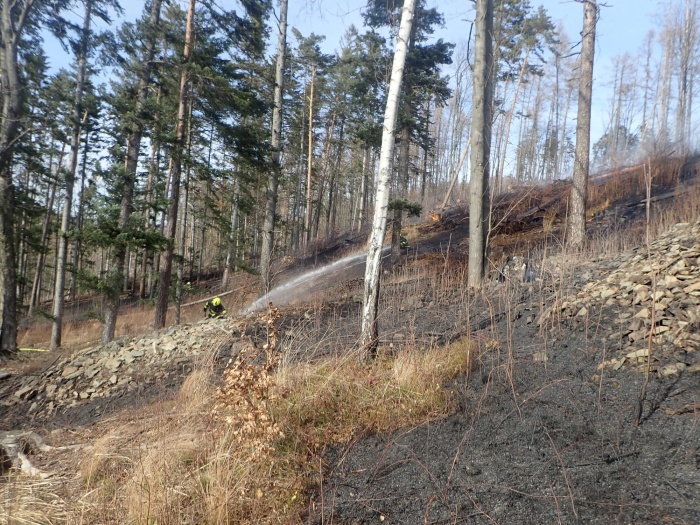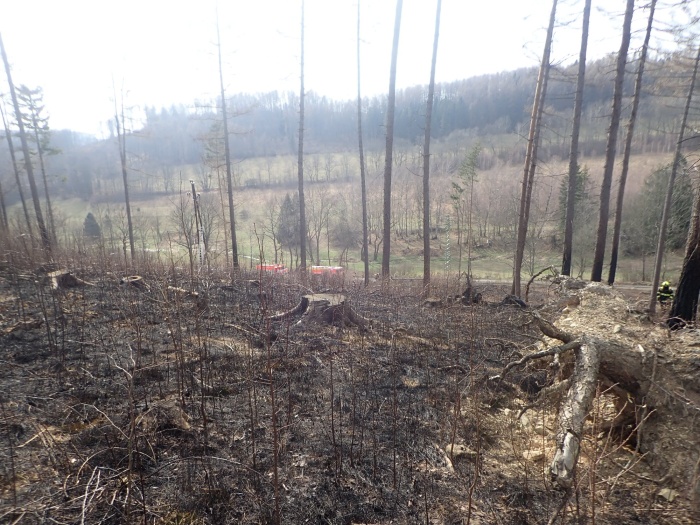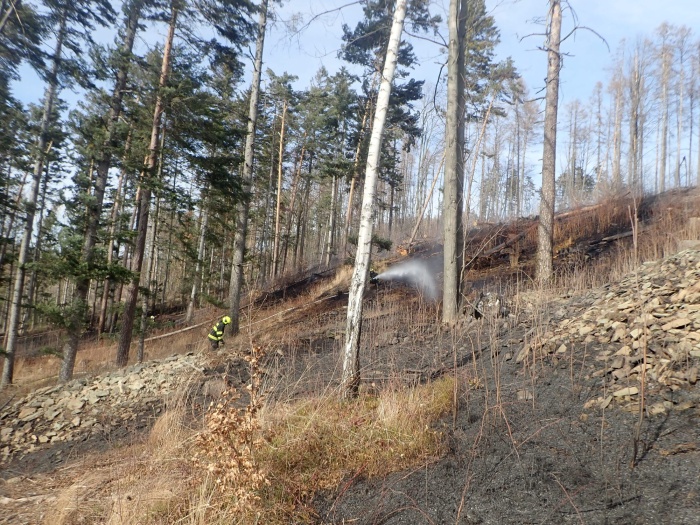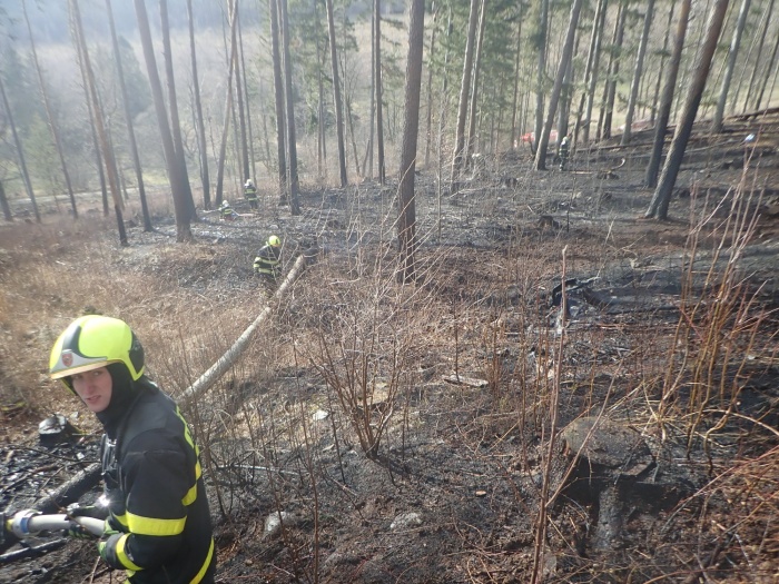 Deset jednotek hasičů zasahovalo šest hodin u pondělního (16.3.2020) požáru lesního porostu na okraji obce Hošťálkovy (okres Bruntál), za který může spadlý elektrický drát vysokého napětí, na který spadl strom během větrného poryvu.