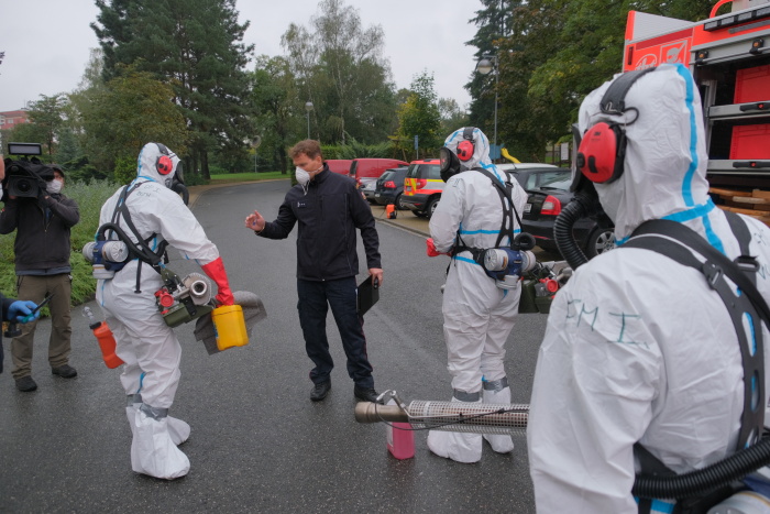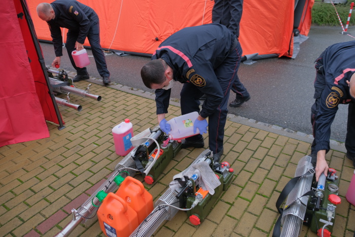 Dvojice hasičů v hermeticky uzavřených ochranných oblecích, rukavicích a speciálních maskách Dräger s filtry (a se sluchátky či špunty do uší) se obvykle střídají v používání až 18 kg těžkého generátoru (hmotnost po jeho naplnění). Zhruba po 40 minutách je potřeba generátor opět naplnit pečlivě testovaným a osvědčeným desinfekčním prostředkem (Virkon S) a benzínem.
