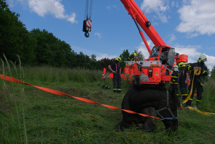 Šestiletého jezdeckého koně Playboye zachraňovali ve středu 2.6.2020 odpoledne v obci Doubrava na Karvinsku hasiči s pomocí jejich automobilového jeřábu, i s pomocí místních chovatelů a veterináře, když při pastvě ve vysoké trávě spadl do skryté hluboké jámy v zemi a nemohl se sám vydrápat ven.
