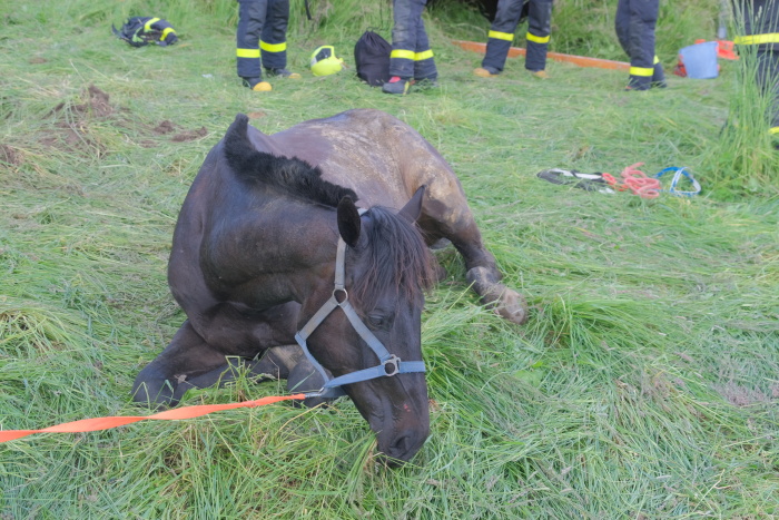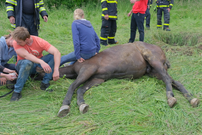 Kůň byl po hodině a půl, strávené v jámě, a po stresujícím vyproštění brzy v pohodě. Ihned po vytažení si na něj pro jistotu mladí chovatelé sedli, aby nějakou nečekanou reakcí neohrozil zasahující hasiče a další osoby. Pak už ležel na nohách, v klidu přežvykoval dlouhou šťavnatou trávu a nepohrdl ani kbelíkem vody. Při odjezdu hasičů, kterým vděčná majitelka plnokrevníka a její kolegové několikrát poděkovali, už stál. Podle veterináře vyvázl bez zranění.