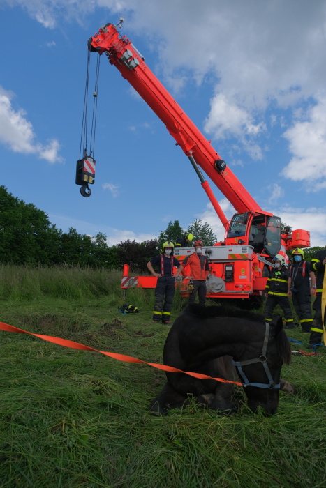 Venku plnokrevníkovi zůstala pouze hlava a přední nohy, na zadních několik desítek minut křečovitě stál na dně úzké jámy, která jej téměř obepínala (viz obrázek č. 2 vpravo). Hasiči uvázali popruh, vedoucí z ramene automobilového jeřábu Demag/Terex, koni zepředu přes obě přední nohy, zezadu se do opatrného vytahování zadních noh a těla pomocí popruhu, zavěšeného na dřevěném trámku, zapojila desítka silných zasahujících hasičů (zvedali ten trámek).