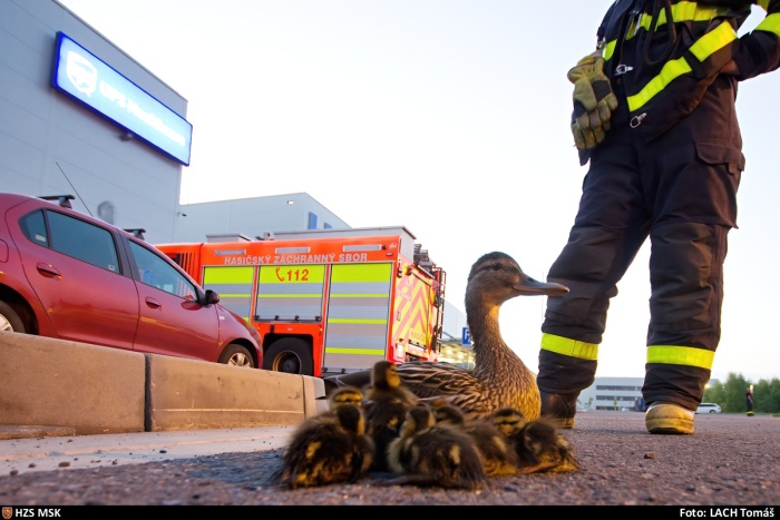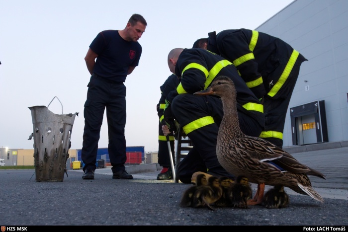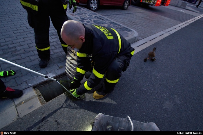 Jednodušší, ale minimálně stejně pečlivou měli práci se záchranou živých tvorů hasiči ze stanice HZS MSK v Ostravě-Přívoze, kteří vyjeli v pondělí po 20. hodině do Ostravy-Hrabové zachraňovat malé kachničky z metr hlubokého kanálu s úzkým otvorem. Hasiče na ně, respektive na nervózně pobíhající a zoufale kdákající kachnu-matku, upozornili pracovníci průmyslového areálu.