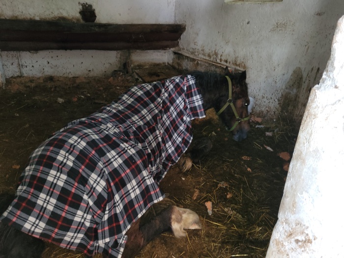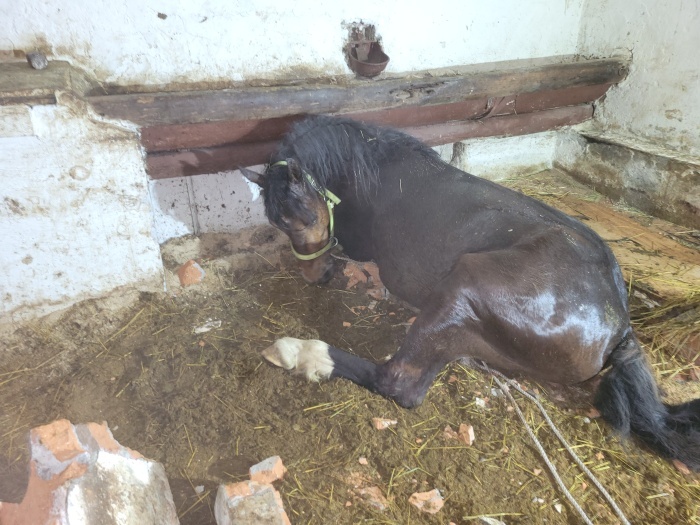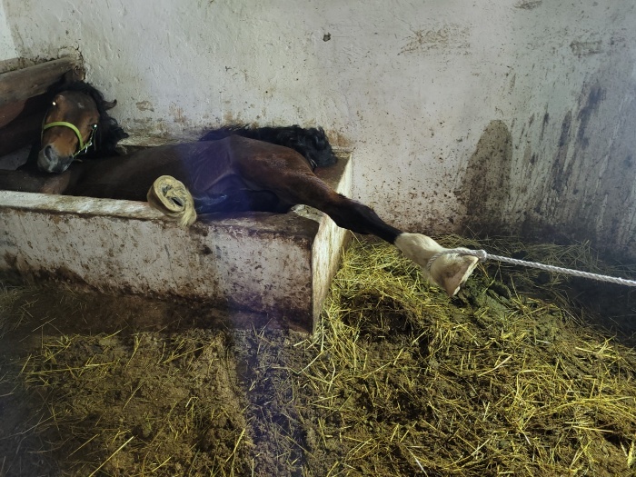 Koně pak posunuli do polohy vleže (ležel na nohou) tak, jak jim to doporučil veterinář, a přikryli ho dekou. Ten dal vysílenému koni infuzi. Kůň, který pravděpodobně ležel ve žlabovém zajetí už od noci z neděle na pondělí, podle něj potřeboval minimálně několik desítek minut či hodin na načerpání ztracené energie. Pak se prý sám postaví.