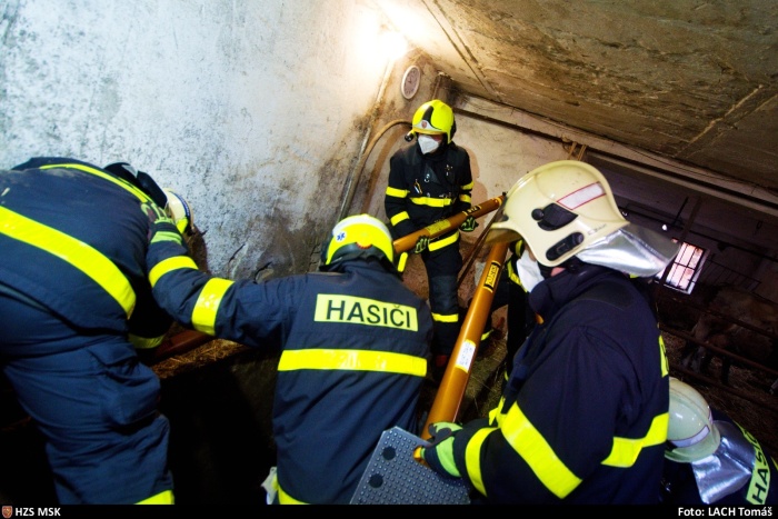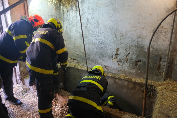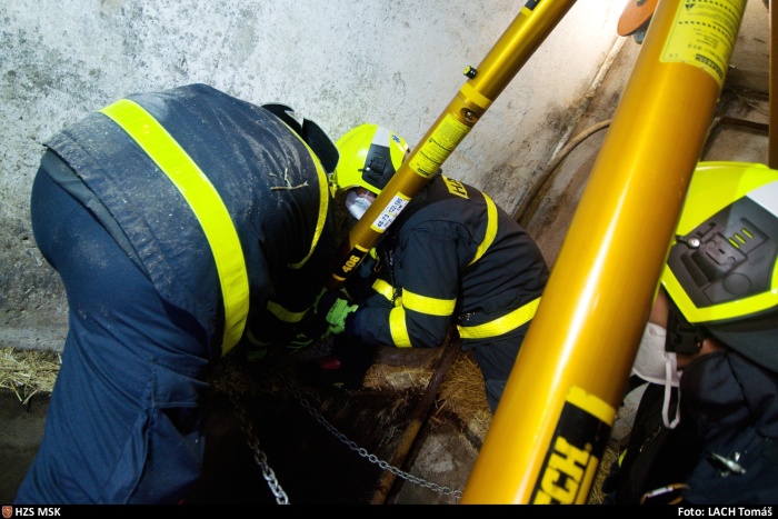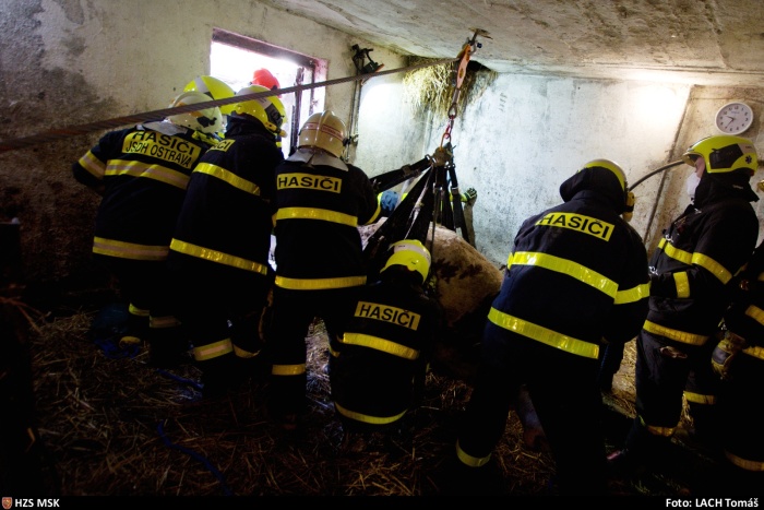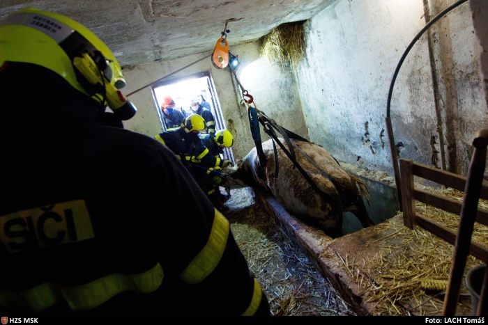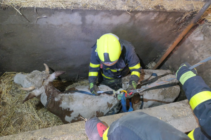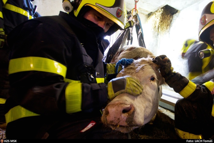 Tři jednotky hasičů zachraňovaly ve středu 16.12.2020 dopoledne v Ostravě-Nové Bělé čtyřsetkilogramovou krávu, která se uvnitř chléva propadla zakrývacími plechy do téměř tři metry hluboké betonové jímky, částečně naplněné vodou. Hasiči ji bez zranění vytáhli ven zhruba během hodiny pomocí speciálního popruhu pro velká zvířata na laně a kovové kladky, upevněné přes provrtaný strop.