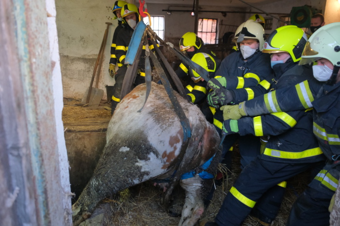 Po chvíli se – za asistence kladky s lanem i majitele – kráva v klidu zvedla na všechny čtyři nohy a nechala se jím odvést na své oblíbené místo ve chlévě, kde začala spokojeně přežvykovat. Vděčný majitel hasičům děkoval.