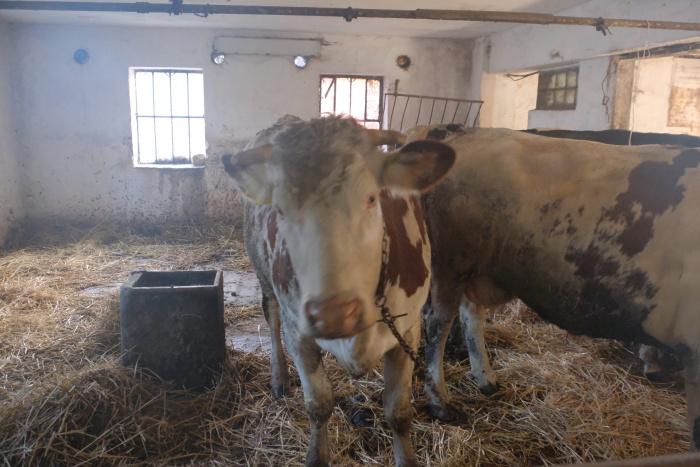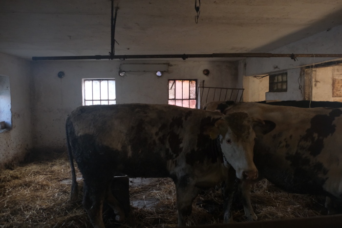 Těžká kráva v nejlepších letech stála v hluboké betonové jímce uvnitř chléva, kolem ní několik kusů plechové střešní krytiny, kterou propadla a kterou hasiči ihned odtáhli na dvorek.