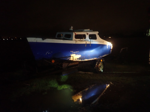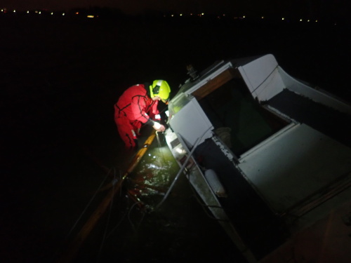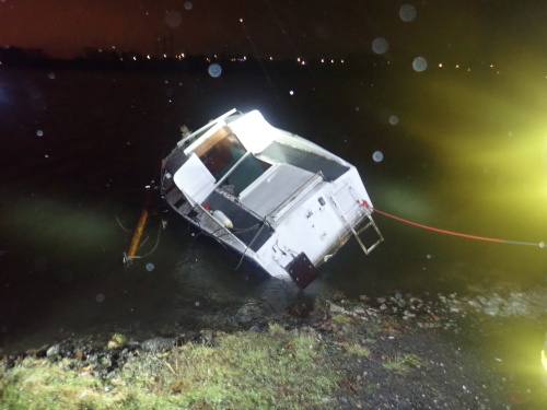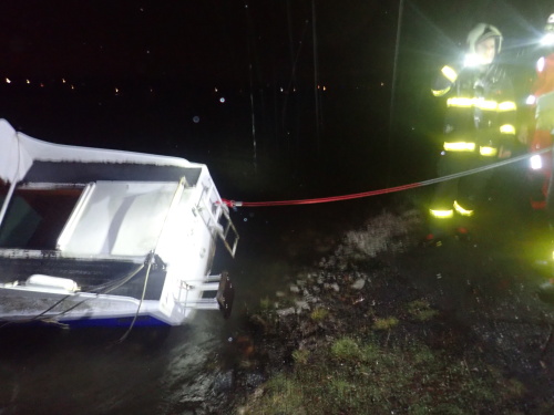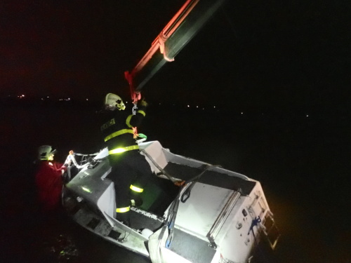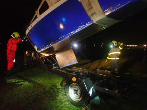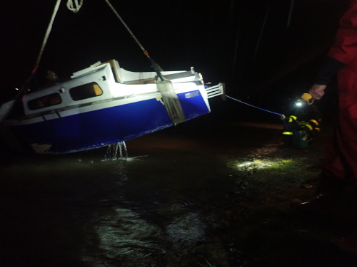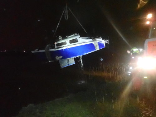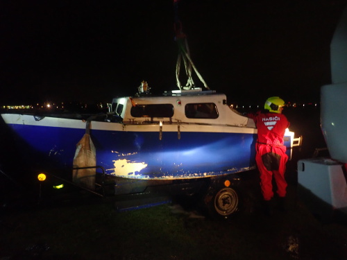 Hasiči nejprve zafixovali hákem zmítající se a částečně poškozenou plachetnici (již se zlomeným stěžněm) domácí výroby bez registrace (4 metry dlouhá, 1,8 metru široká, prázdná vážila kolem 500 kg), plnou vody. Pak v silném dešti a ledové vodě navázali kocábku popruhy na hydraulickou ruku vyprošťovacího speciálu a ten ji patrně přenesl na podvalník majitele lodě.