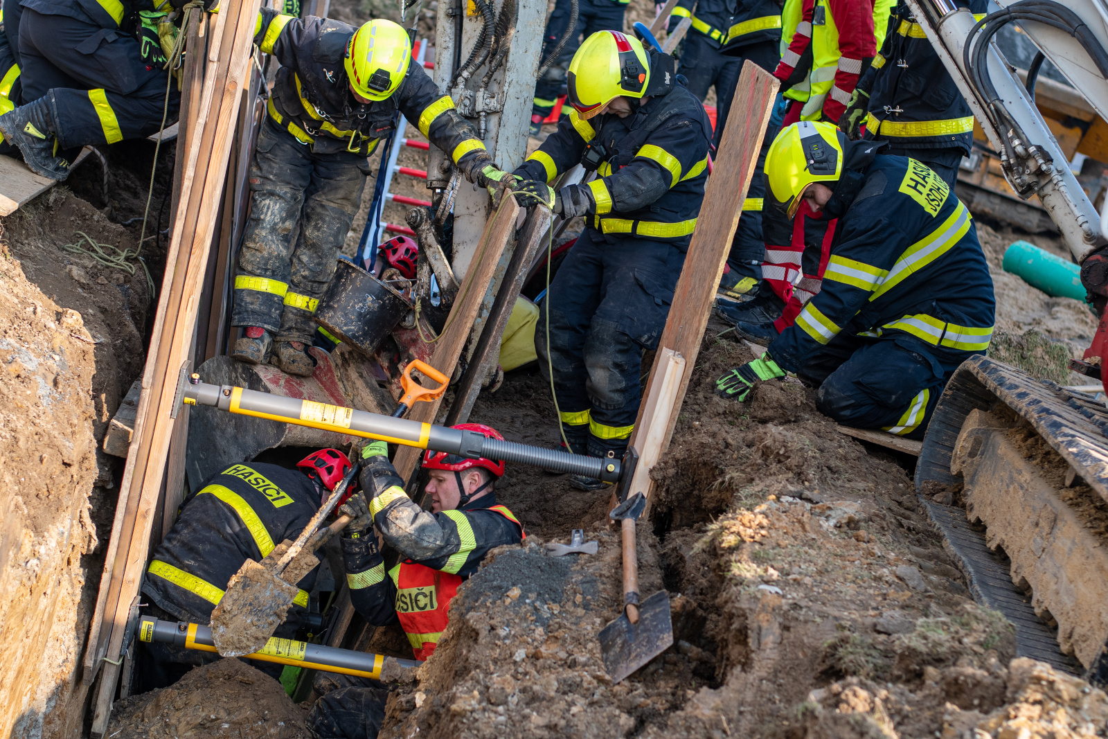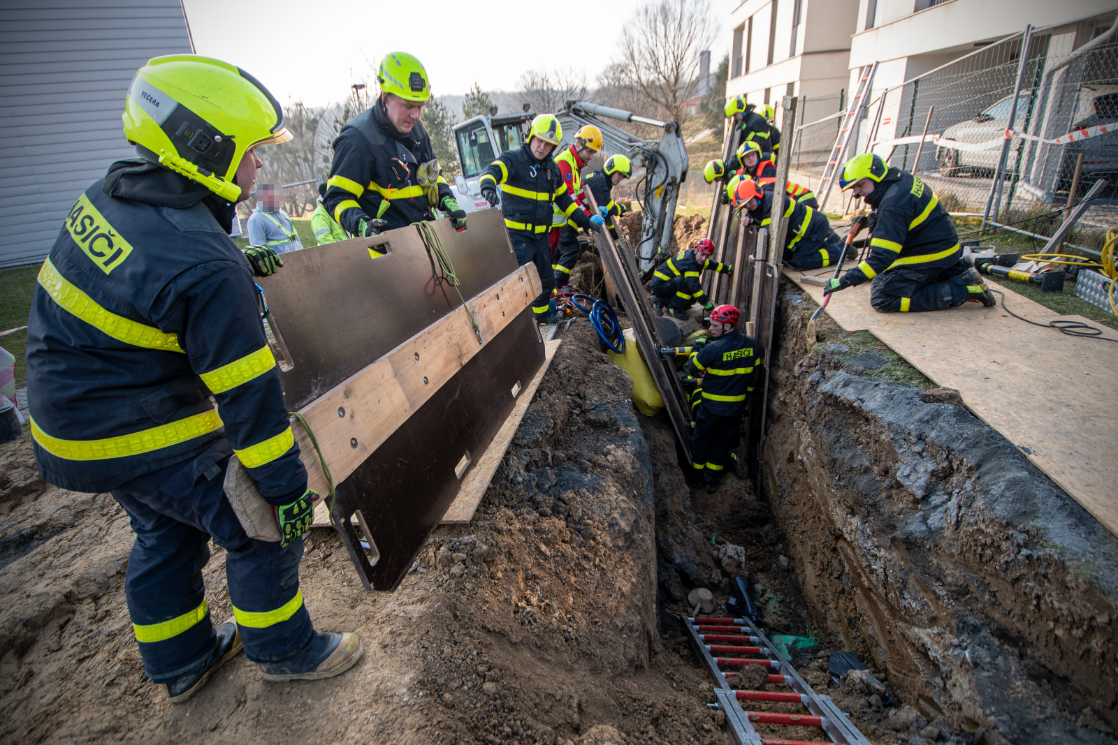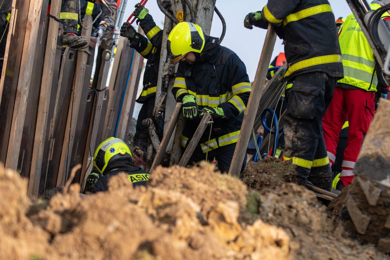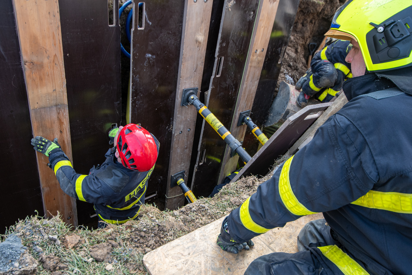 Každá chyba mohla být osudná. Hasiči proto nejprve stabilizovali stěny výkopu, aby zabránili dalšímu pádu zeminy. K tomu využili stabilizační desky, rozpěrné tyče a nízkotlaký vak, který vyplnil mezery mezi deskou a stěnou výkopu.