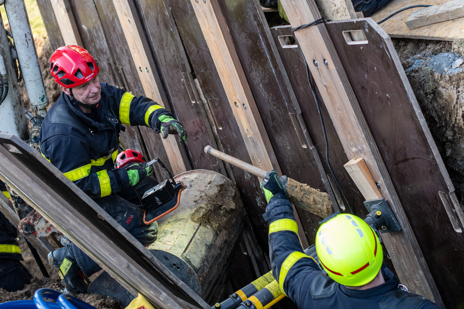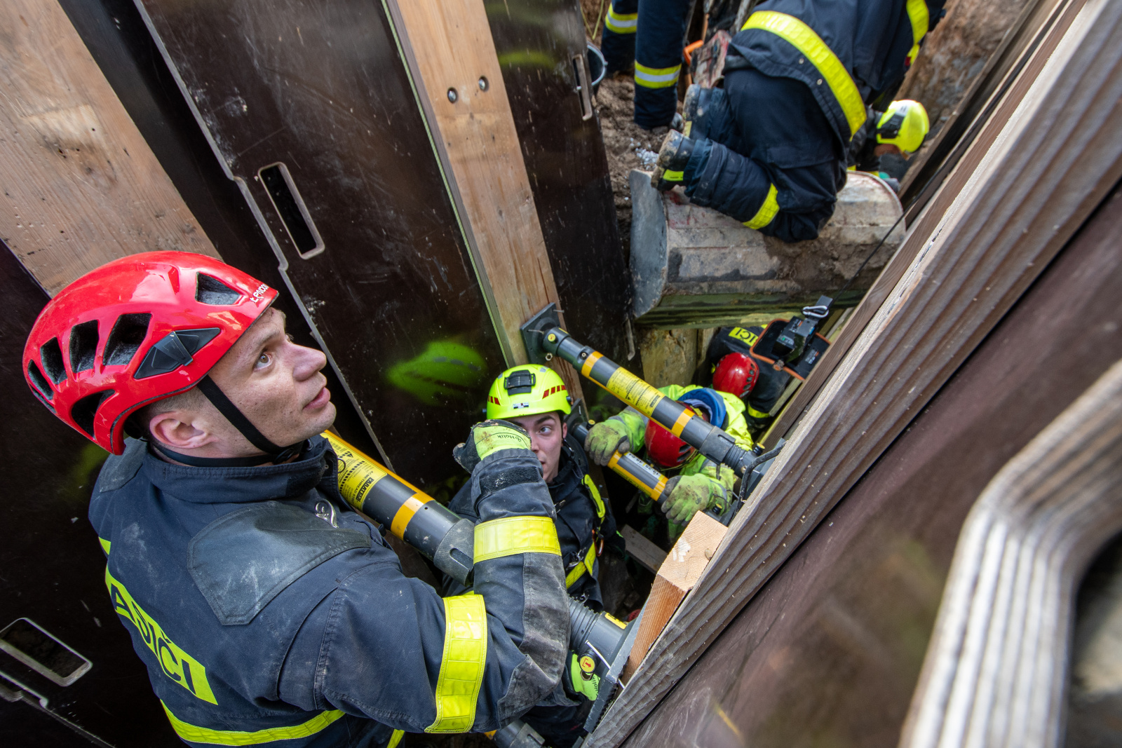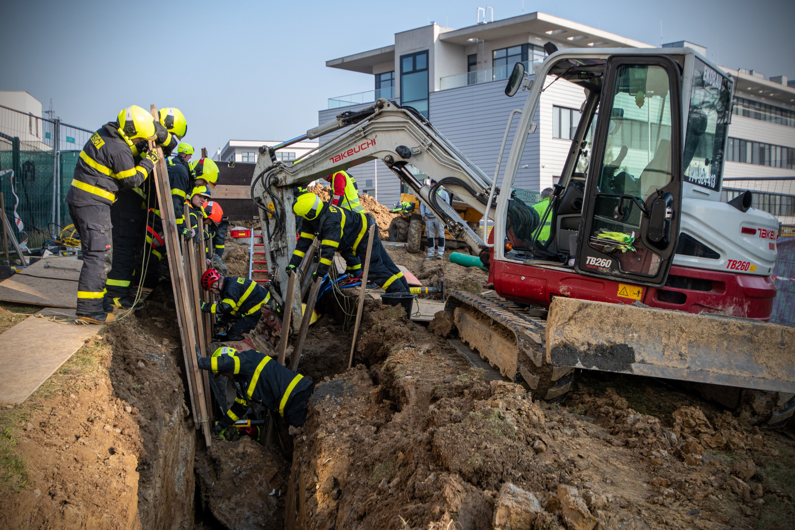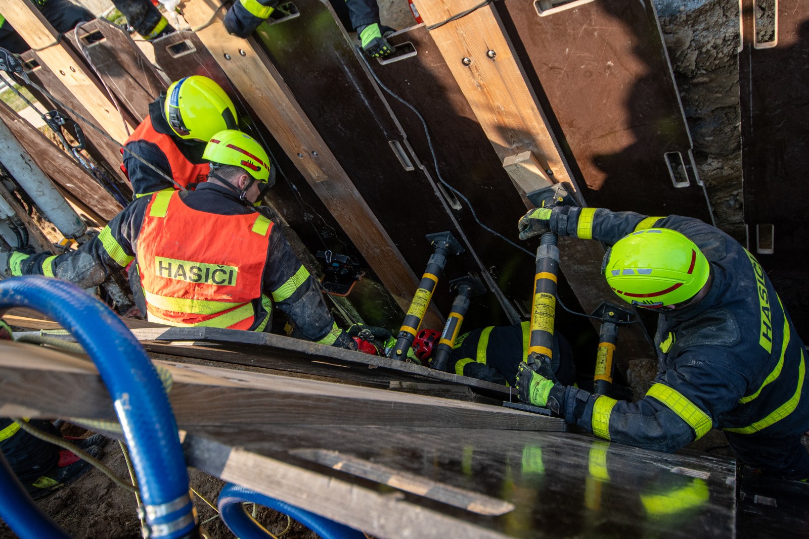 Každá chyba mohla být osudná. Hasiči proto nejprve stabilizovali stěny výkopu, aby zabránili dalšímu pádu zeminy. K tomu využili stabilizační desky, rozpěrné tyče a nízkotlaký vak, který vyplnil mezery mezi deskou a stěnou výkopu.