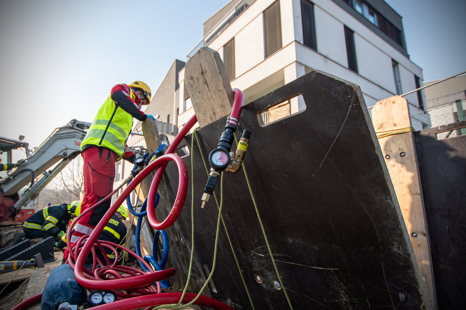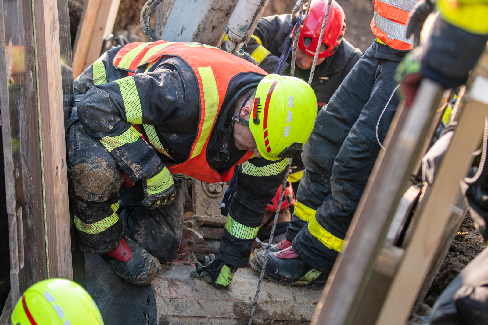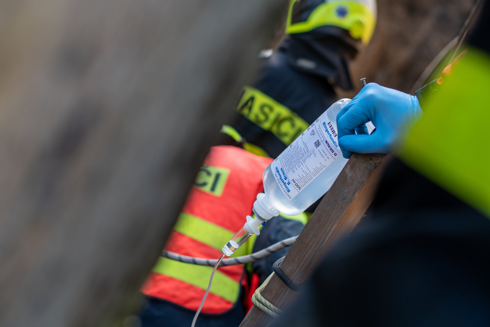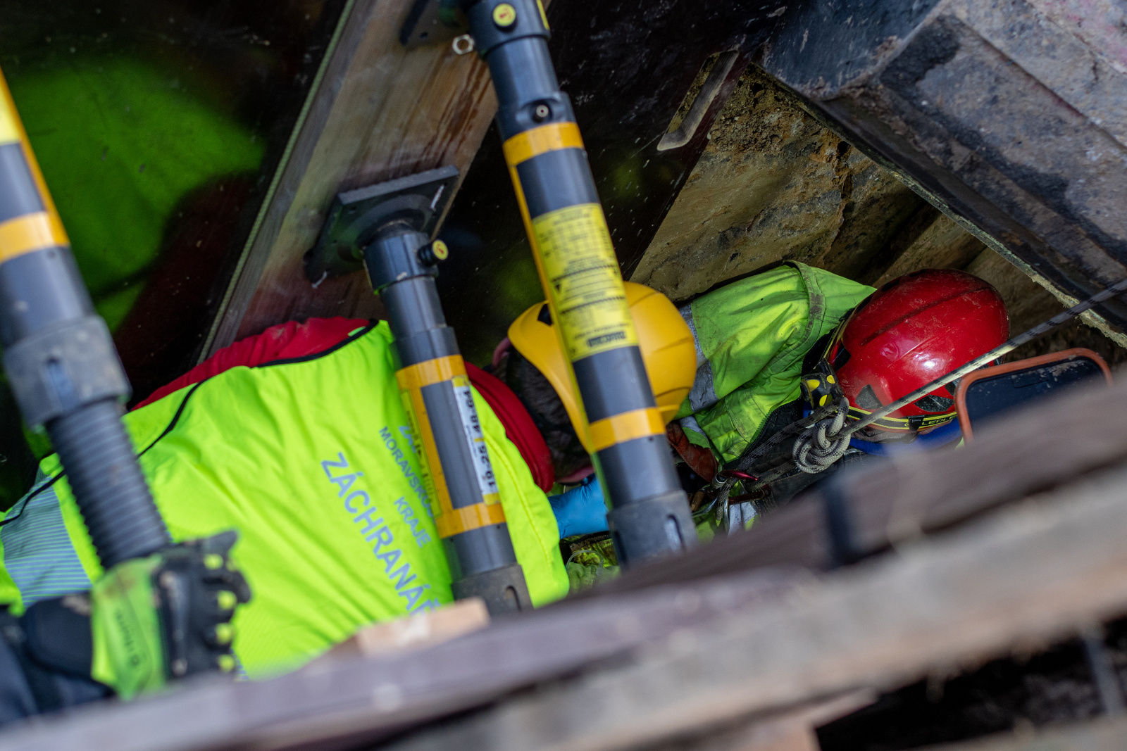 Každá chyba mohla být osudná. Hasiči proto nejprve stabilizovali stěny výkopu, aby zabránili dalšímu pádu zeminy. K tomu využili stabilizační desky, rozpěrné tyče a nízkotlaký vak, který vyplnil mezery mezi deskou a stěnou výkopu.