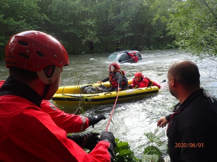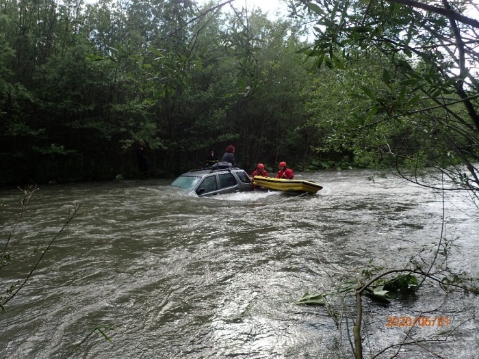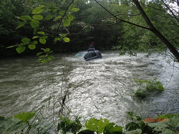 Automobil se tak vydal v pondělí 1.6.2020 v podvečer překonat brod, ale byl stržen silným proudem a unášen. Muži středního věku se podařilo dostat na břeh, žena středního věku ale zůstala uvnitř. Velkým štěstím pro ni a malého pejska s ní bylo, že se vodou vláčený automobil pouze otáčel kolem svislé osy, ale neobrátil se na střechu. Navíc zhruba po 200 metrech se zachytil o skrytou kamennou hrázku.