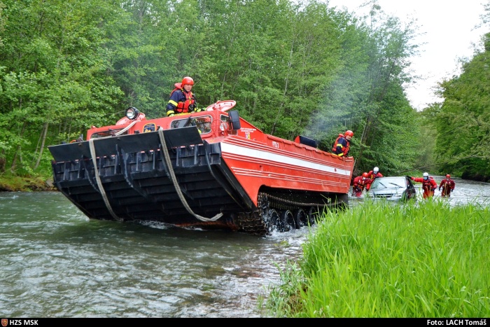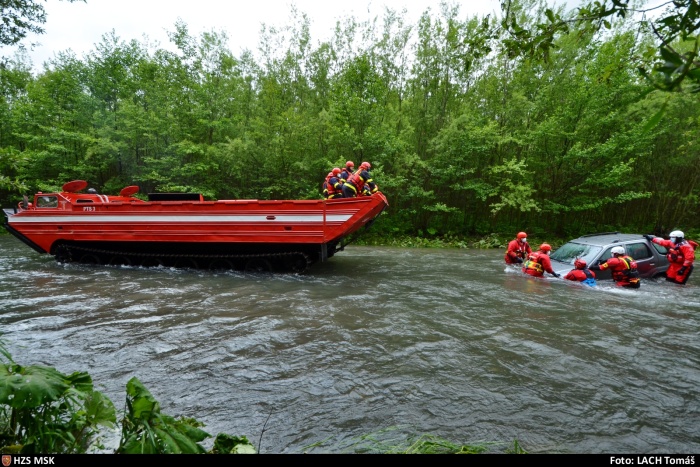 Transportér ve spolupráci s profesionálními (Frýdek-Místek, Nošovice) a dobrovolnými hasiči (Raškovice) odtáhl automobil tokem Morávky zpět k brodu, kde byl v úterý dopoledne úspěšně vytažen na břeh.