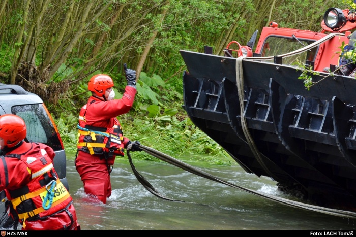 Kvůli silnému proudu vody bylo Suzuki zajištěno lany a na jeho vyproštění hasiči museli počkat na opadnutí vody (snížení průtoku z vodní nádrže Morávka dohodli s vodohospodáři) až v úterý 2.6.2020 dopoledne, kdy si hasiči přivolali na pomoc obojživelný pásový transportér PTS 3 ze Záchranného útvaru HZS ČR v Hlučíně.