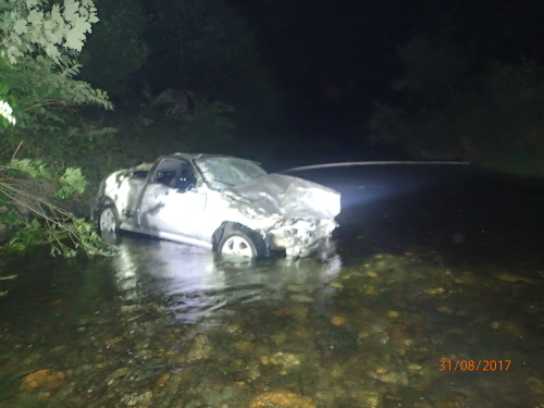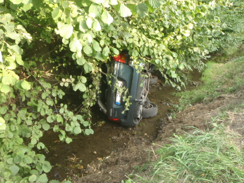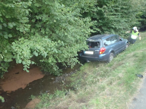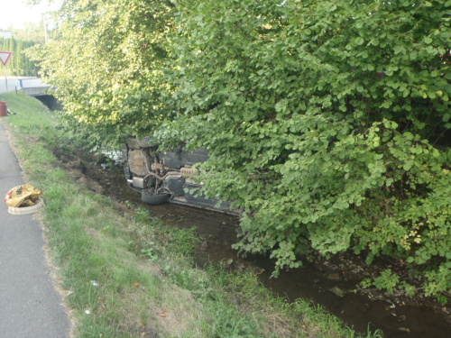 osobního automobilu Subaru Legacy na plyn, který skončil na boku v potoce v Dolním Sklenově. Řidička (ročník 1984) vystoupila z auta nezraněná s pomocí svědka nehody bočními dveřmi.
