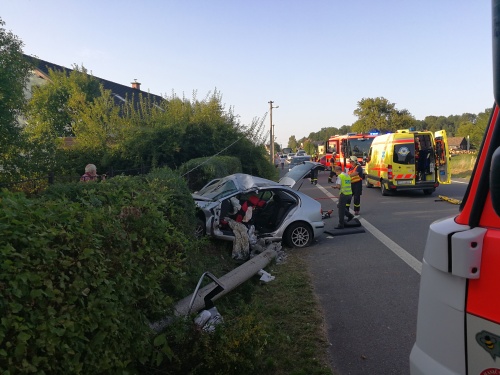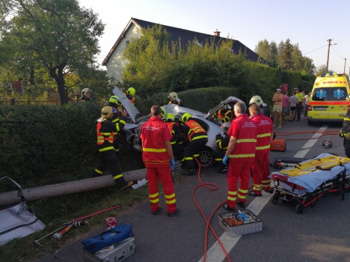 Seat Toledo narazil ve čtvrtek v podvečer v Šenově levým bokem do betonového sloupu veřejného osvětlení, který spadl. Nehoda si vyžádala zranění dvou mladých mužů (oba kolem 23 let), hasiči museli vyprostit řidiče pomocí hydraulických nástrojů. Předali ho do péče týmu ZZS MSK. Po zdokumentování nehody hasiči pomohli s naložením havarovaného Seatu na vozidlo odtahové služby, zajistili poškozený sloup a vedení veřejného osvětlení.