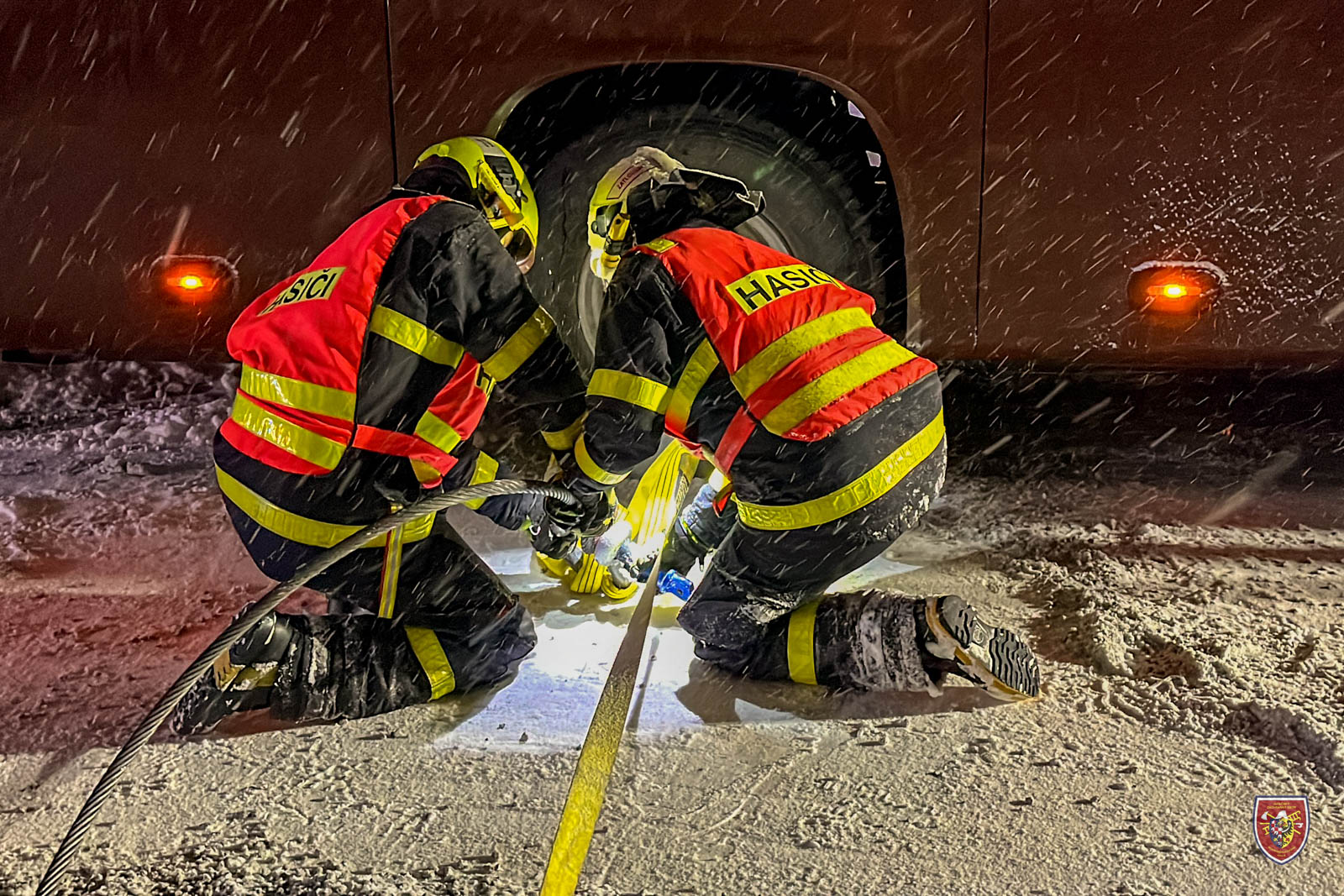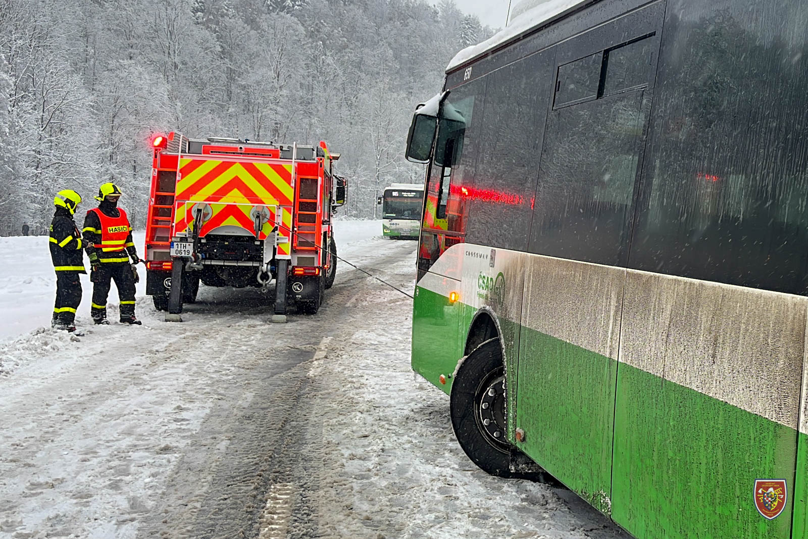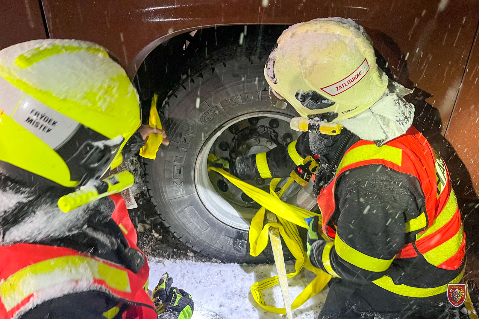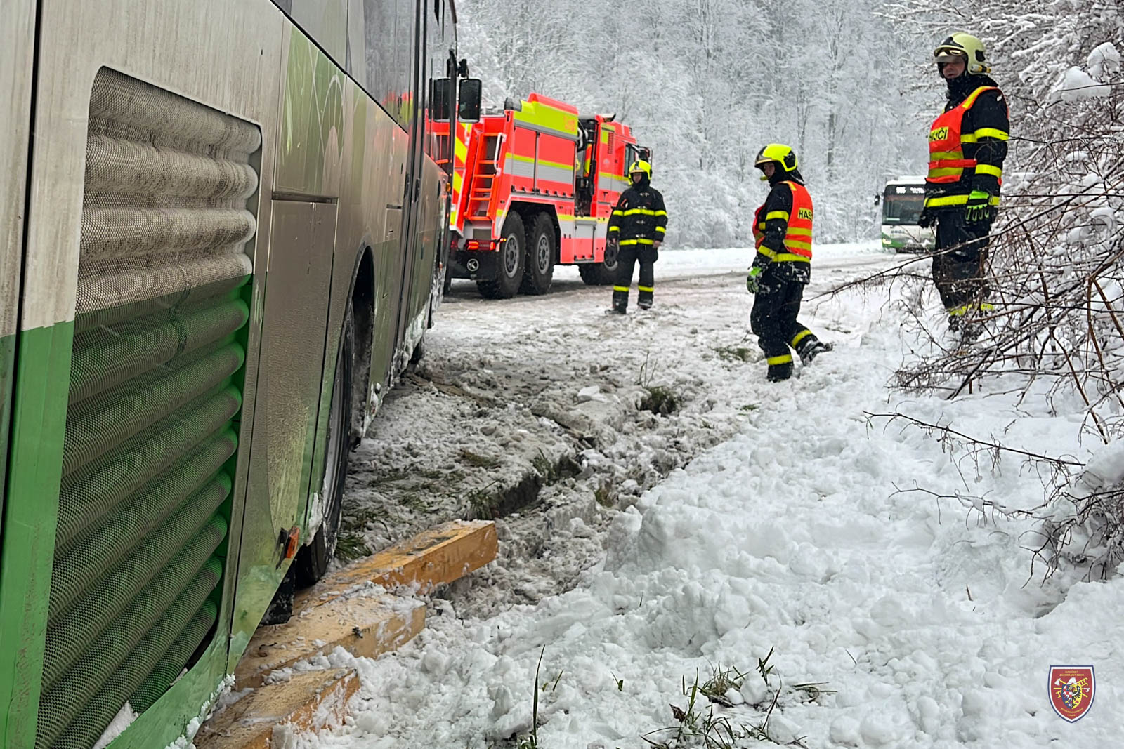 Jeden pomáhali hasiči vytáhnout z příkopu v Metylovicích na Frýdecko-Místecku, řidič v něm cestoval sám, nikdo nebyl zraněn. Hasiči autobus podložili dřevěnými hranoly a vytáhli ho silným navijákem vyprošťovací Tatry.