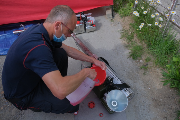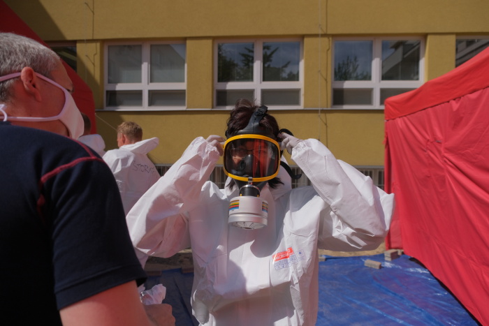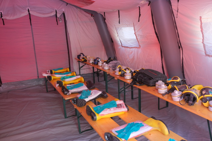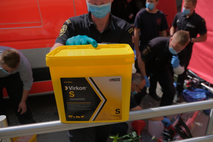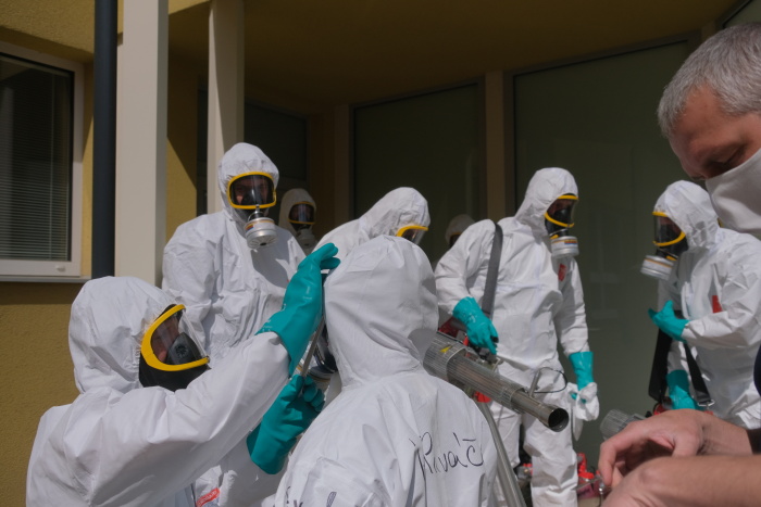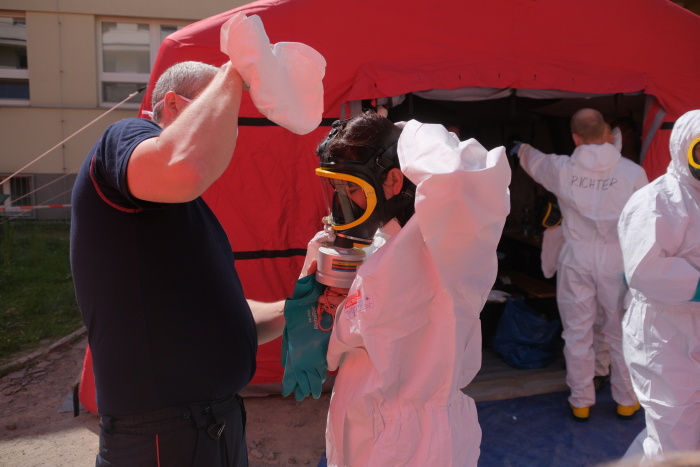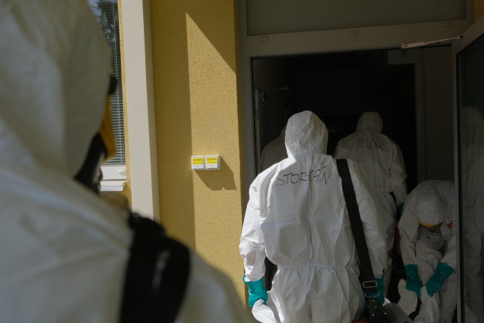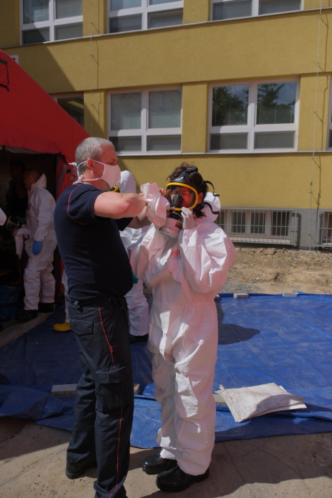 Deset hasičů v hermeticky uzavřených ochranných oblecích, rukavicích a speciálních maskách Dräger s filtry doprovázela uvnitř stejně oděná staniční sestra. Dekontaminace byla hotova hodinu po středečním poledni.