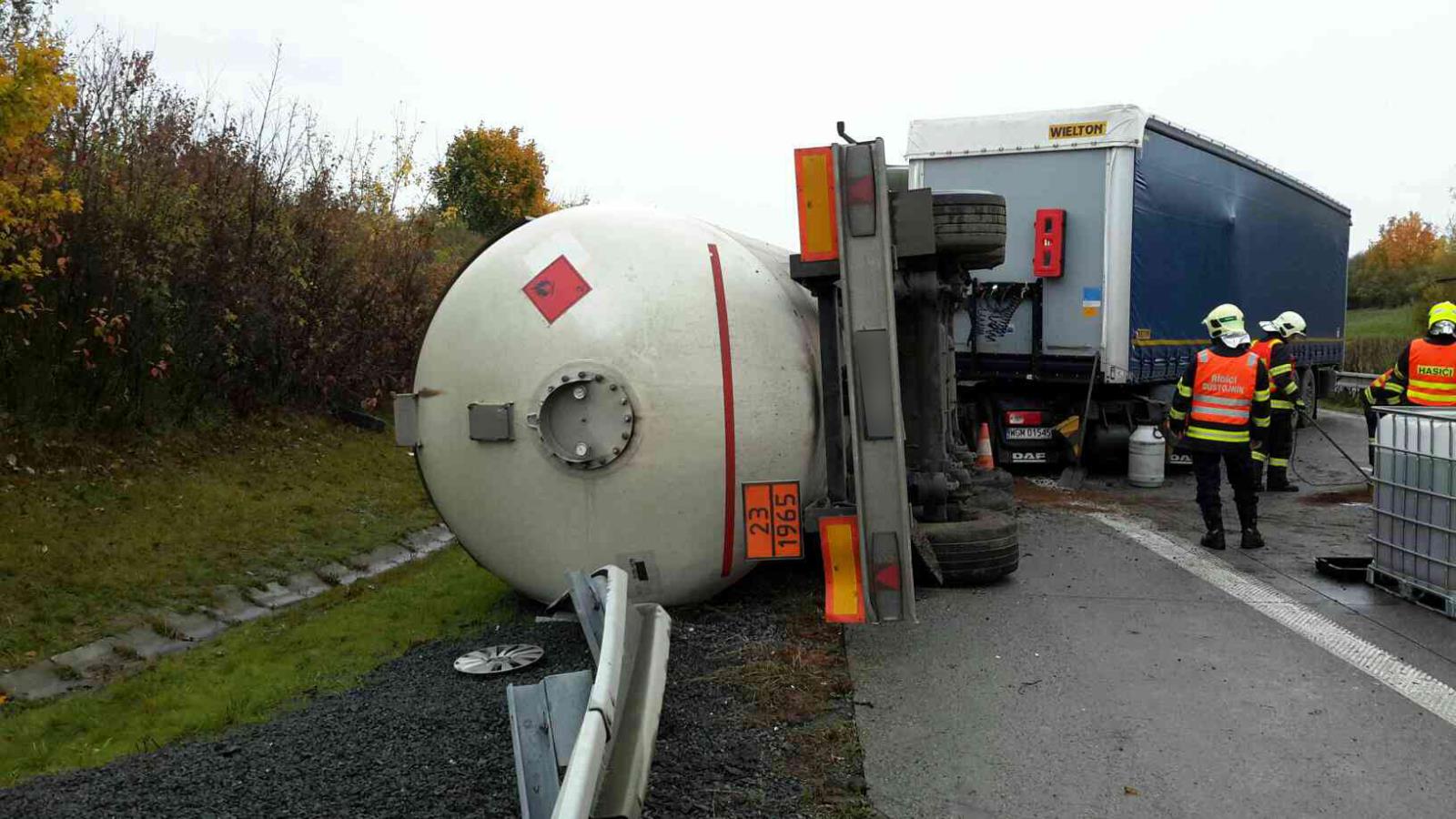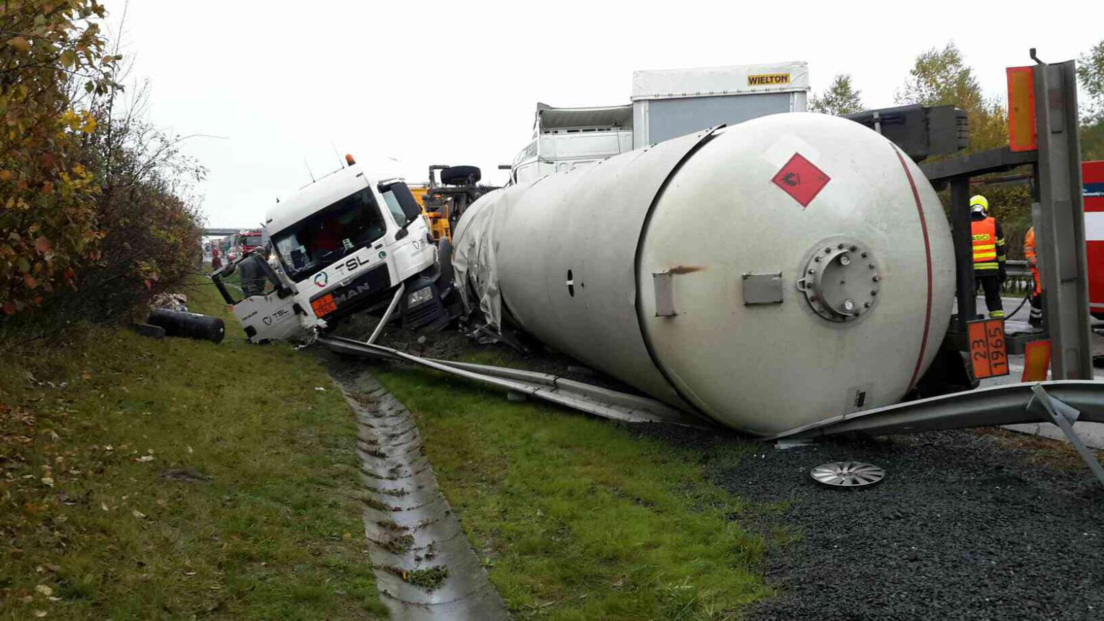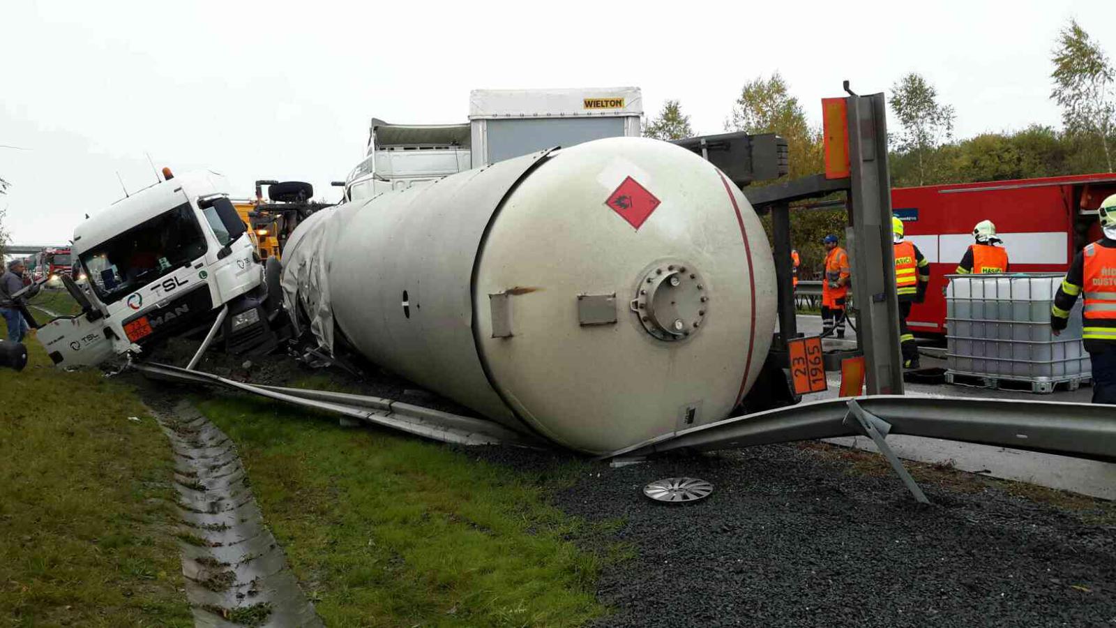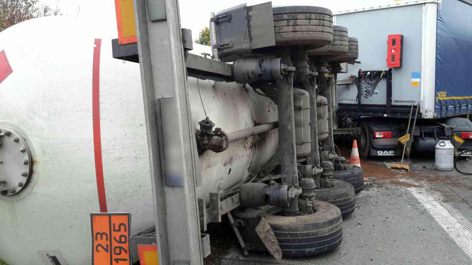 Havarovaný kamion s nábytkem už je vyproštěn, hasiči zasypali uniklou naftu na komunikaci. Po konzultaci s odborníkem na přečerpávání plynu bude nakonec zvolen jiný postup vyproštění havarované cisterny. Plná cisterna se postaví na kola a teprve poté se provede její přečerpání.