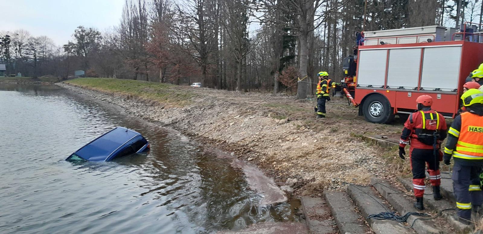 Automobil z rybníka vyprostili hasiči technickým speciálem