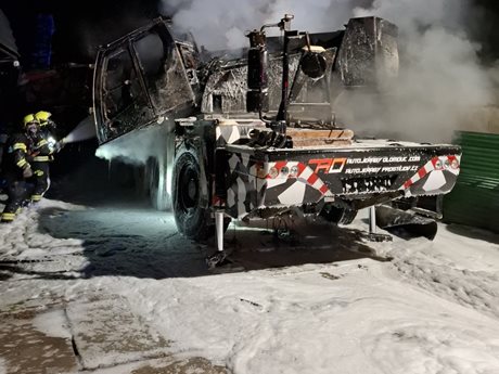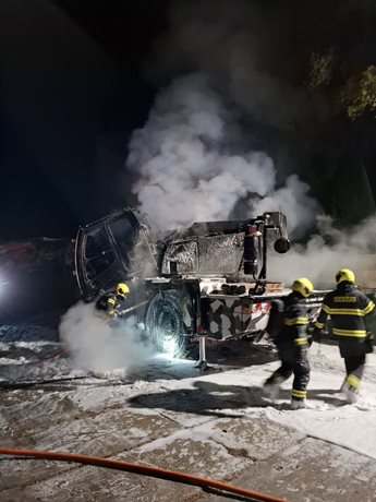 Automobilový jeřáb zachvátily plameny, zasahovaly čtyři jednotky hasičů