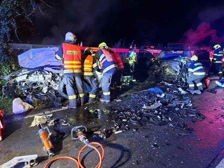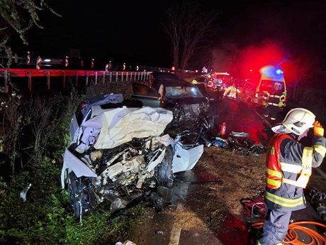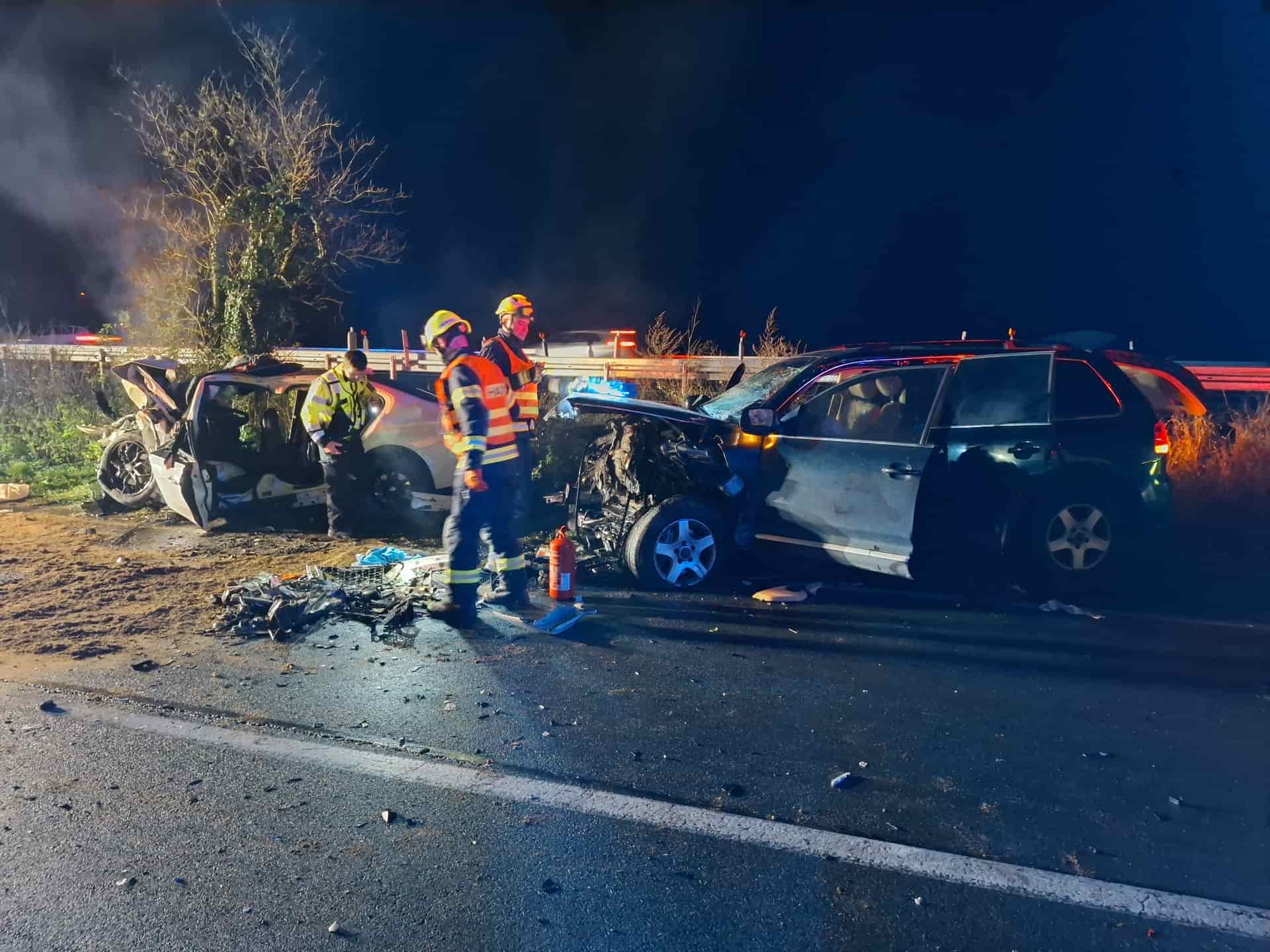 Čelní střet osobních aut zablokoval silnici. Osm zraněných, hasiči vyprošťovali uvězněné