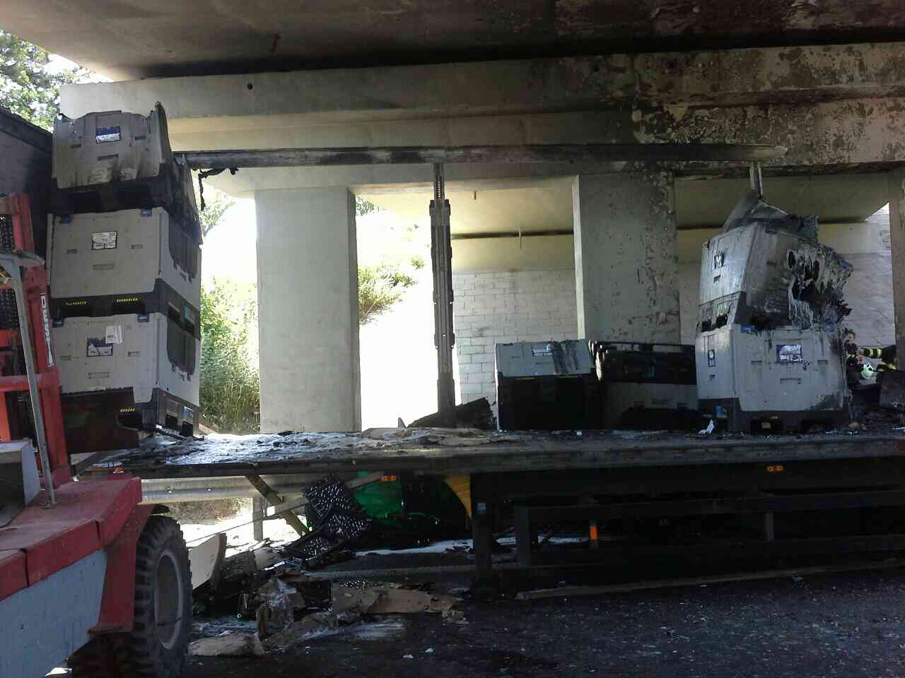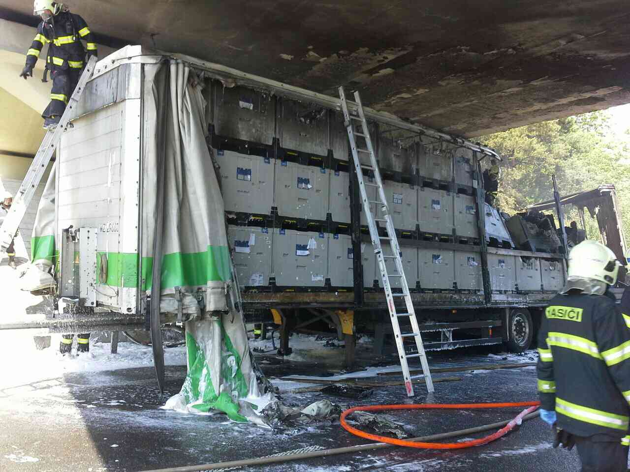Na místo vyjeli profesionální hasiči z Olomouce a z Prostějova a dobrovolní hasiči z Olšan u Prostějova a Prostějova - Vrahovic. Hasiči po příjezdu zjistili, že hoří návěs kamionu včetně nákladu, který kamion převážel. Tím byly autosedačky pro luxusní vozy uložené v plastových přepravkách. Požár začali hasiči likvidovat třemi proudy vody a pěnou. Protože kamion zaparkoval pod mostem, hasiči také chladili mostní konstrukci.