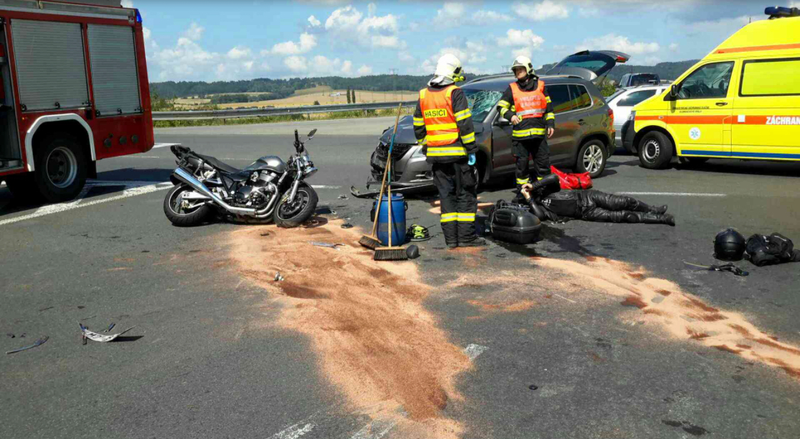 Dvě zraněné osoby po střetu osobního vozidla s motocyklem v Zábřehu směr Postřelmov - taková situace se před odehrála na Šumpersku 26.7. 2018.