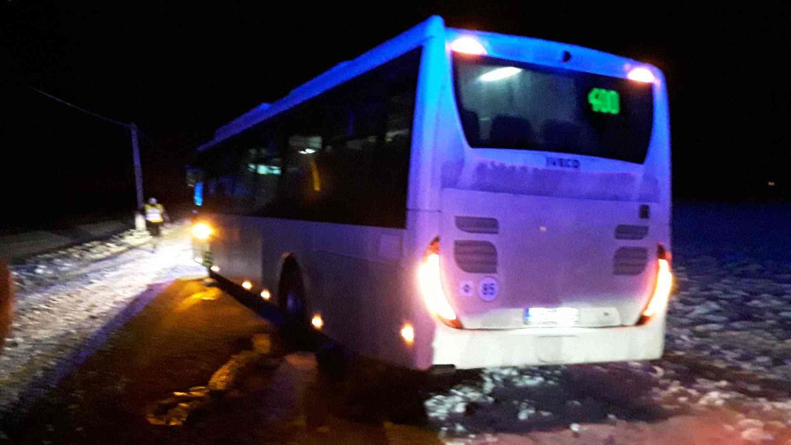 Krátce po páté hodině ranní hasiči přijali informaci o komplikaci dalšího hromadného prostředku pro dopravu - autobusu, dle informací jde o autobus částečně sjetý z komunikaci, blokující dopravu. Uvnitř cestovalo celkem 9 osob a jsou nezraněni. Hasičům se podařilo autobus vyprostit bez poškození.