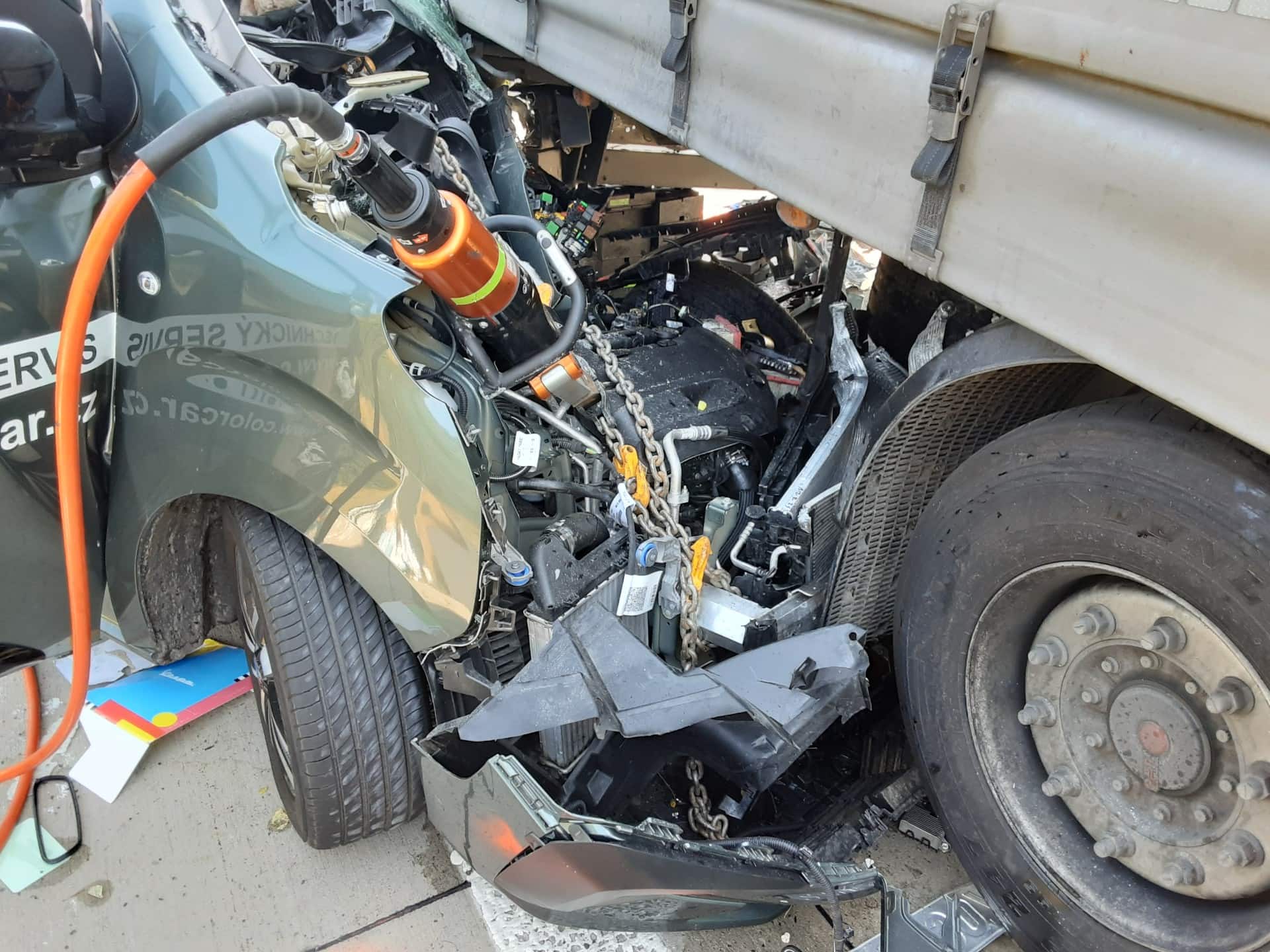 Drama na D1: Řidič uvězněný mezi osobním autem a kamionem