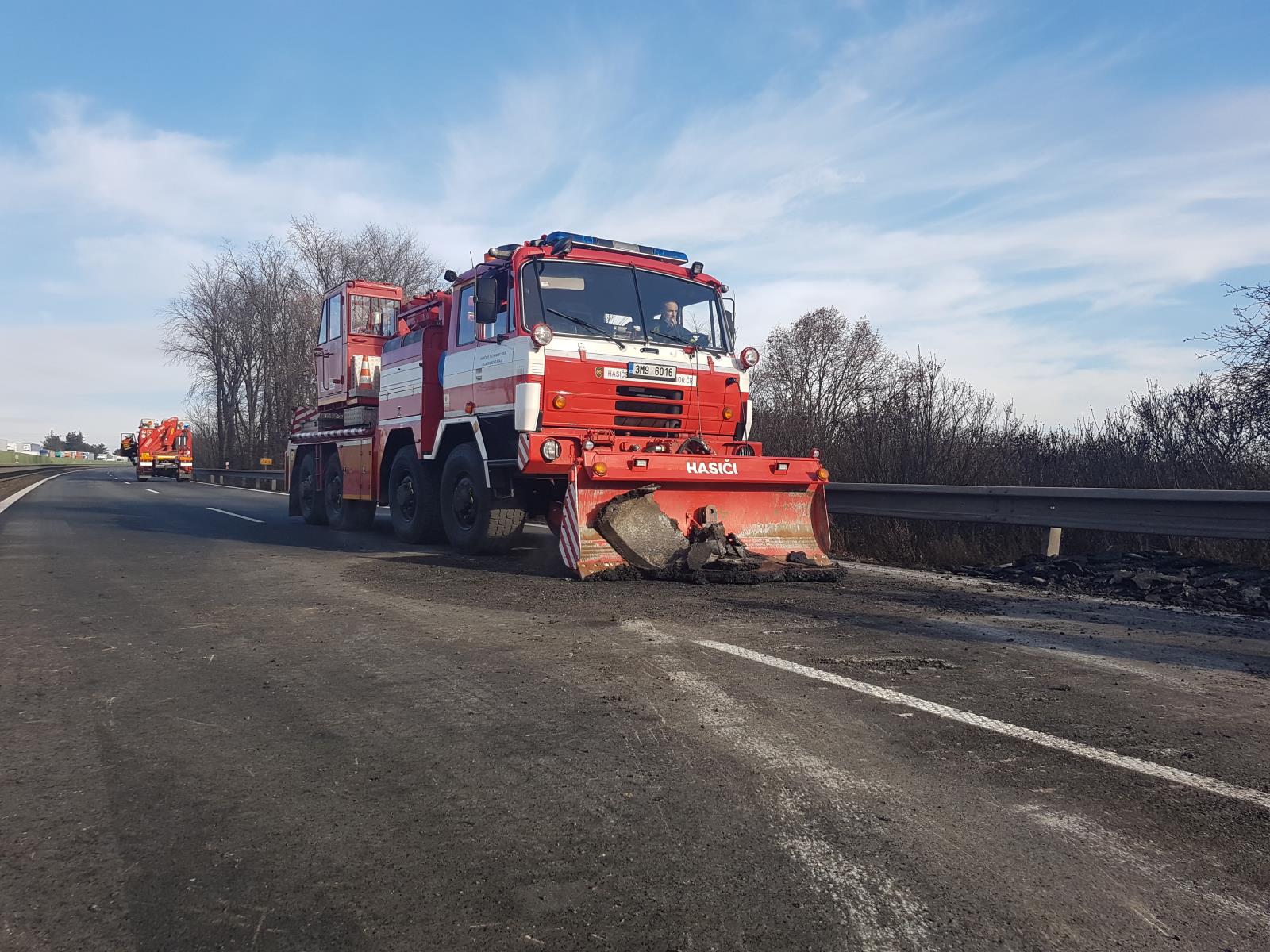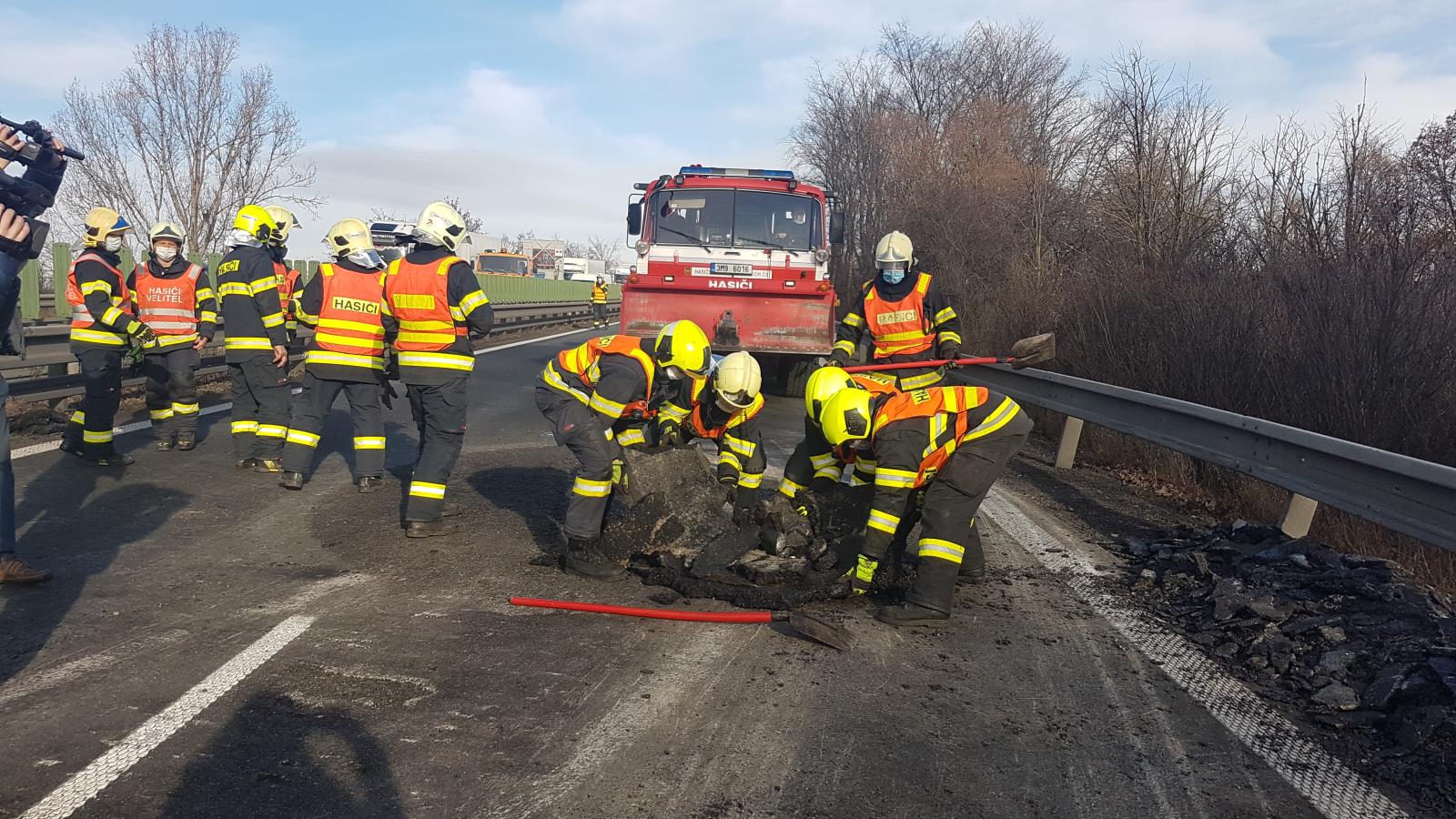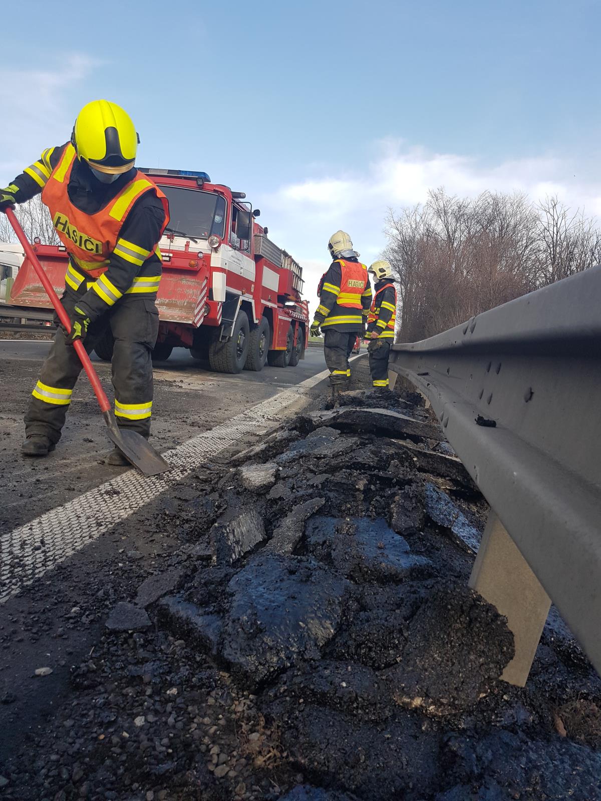 Dvě jednotky se speciální technikou odstranily z vozovky 10 tun tekoucího asfaltu
